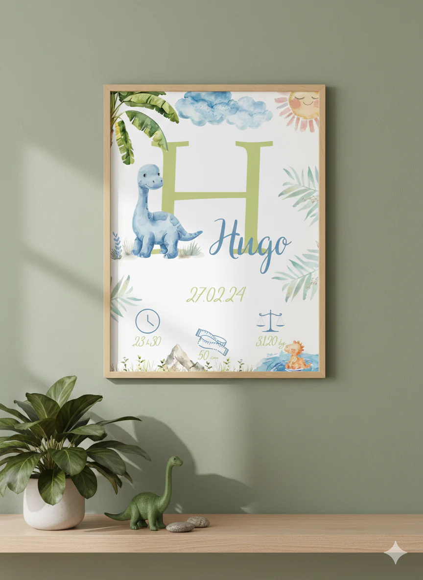 Affiche de naissance personnalisée, les dinos déco chambre garçon