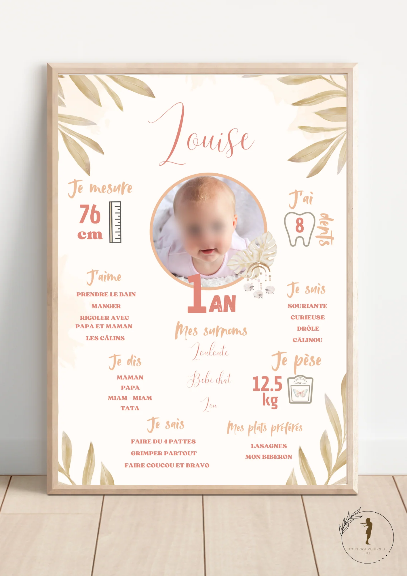 Affiche personnalisée anniversaire, baptême, informations de l’enfant thème boho