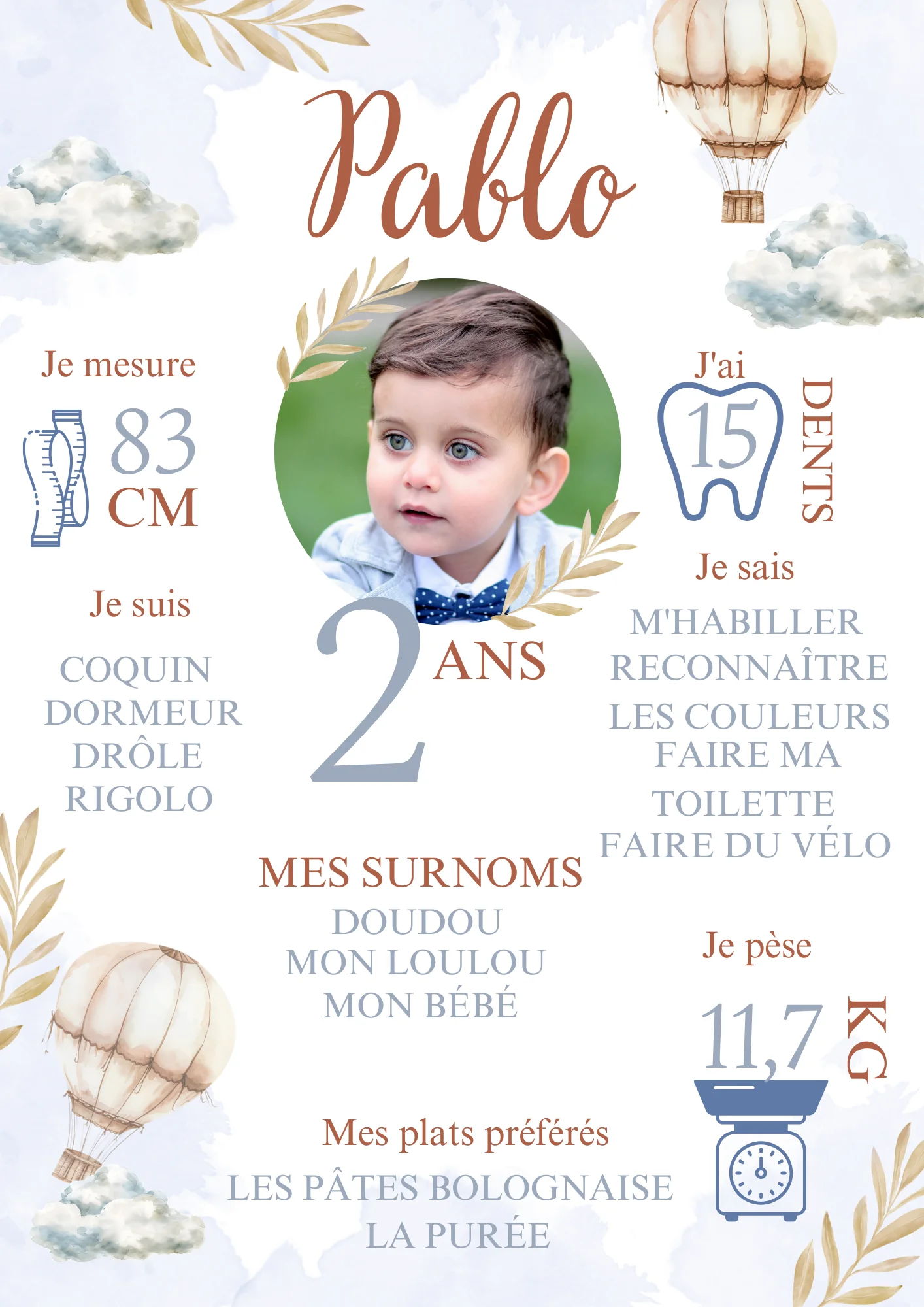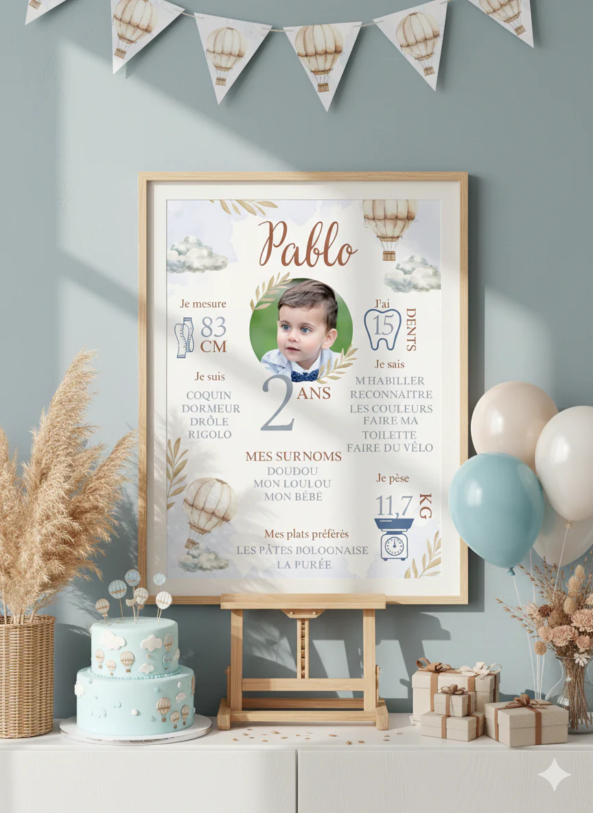 Affiche personnalisée anniversaire » dans les airs » nuage, montgolfière, bleu,