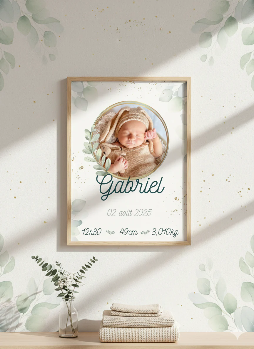 Affiche personnalisée de bébé avec photo thème eucalyptus déco bébé enfant