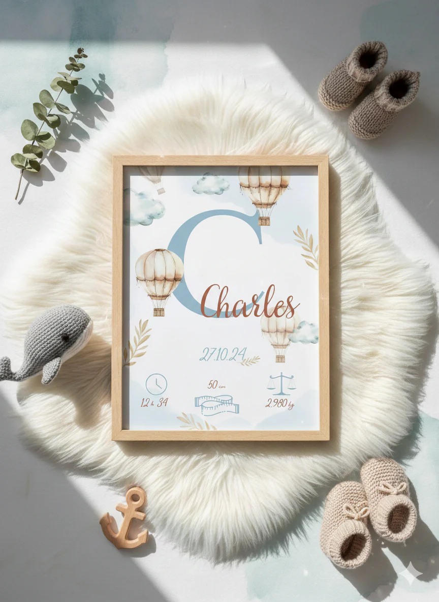 Affiche personnalisée de naissance » dans les airs » montgolfière, bleu, nuages