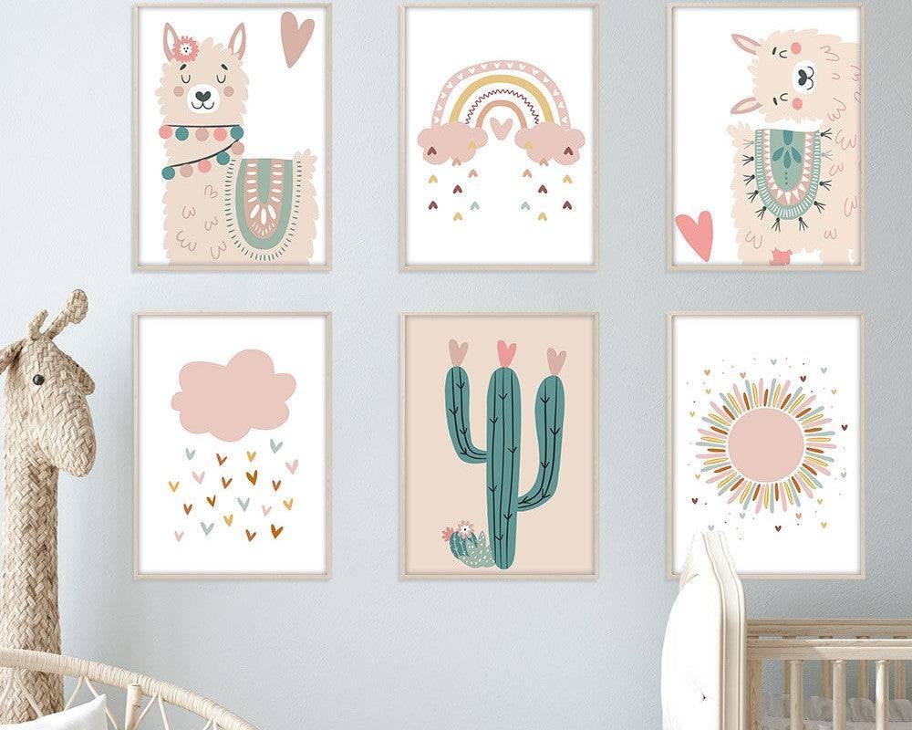 Ces adorables affiches d’alpaga, de cactus et d’arc en ciel dans les teintes rose et beige décoreront à merveille une chambre d’enfant.