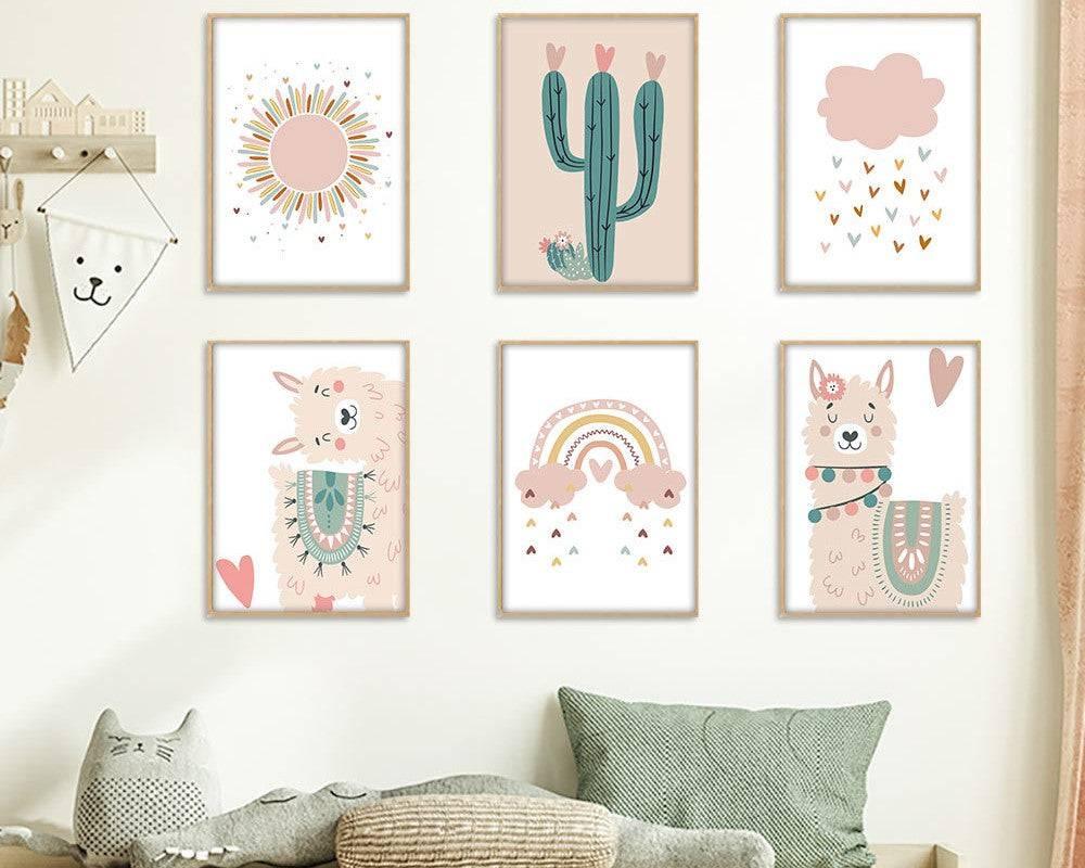 Ces adorables affiches d’alpaga, de cactus et d’arc en ciel dans les teintes rose et beige décoreront à merveille une chambre d’enfant. Plusieurs tailles et modèles disponibles. Cadre non fourni. Impression sur toile.