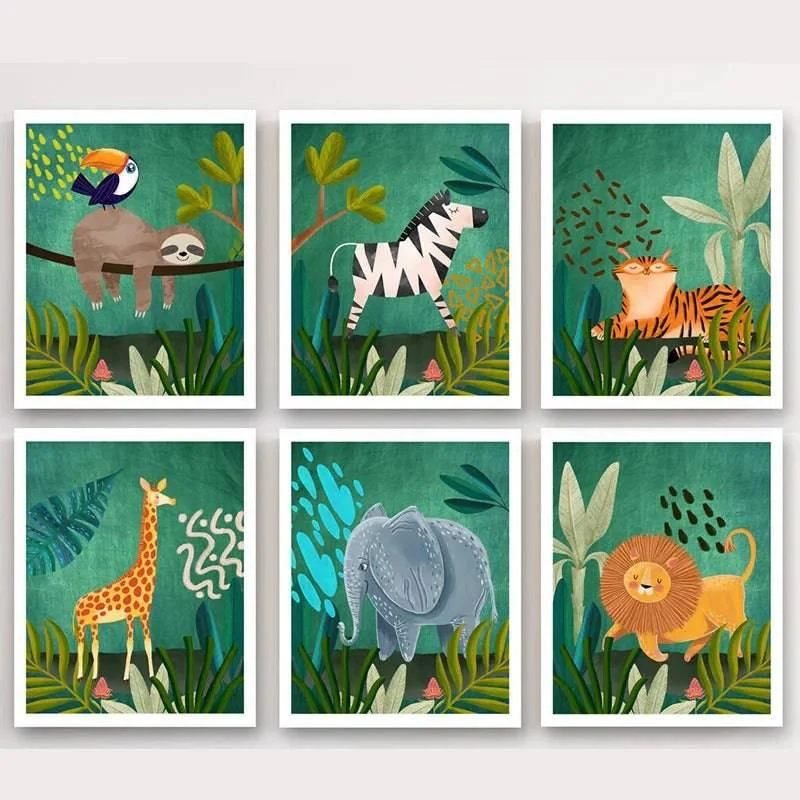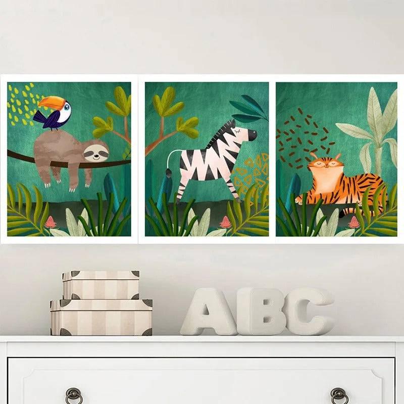 Chaque poster met en scène des animaux exotiques dans des couleurs éclatantes et un vert vif, créant une ambiance joyeuse et pleine de vie dans la chambre de votre enfant.
