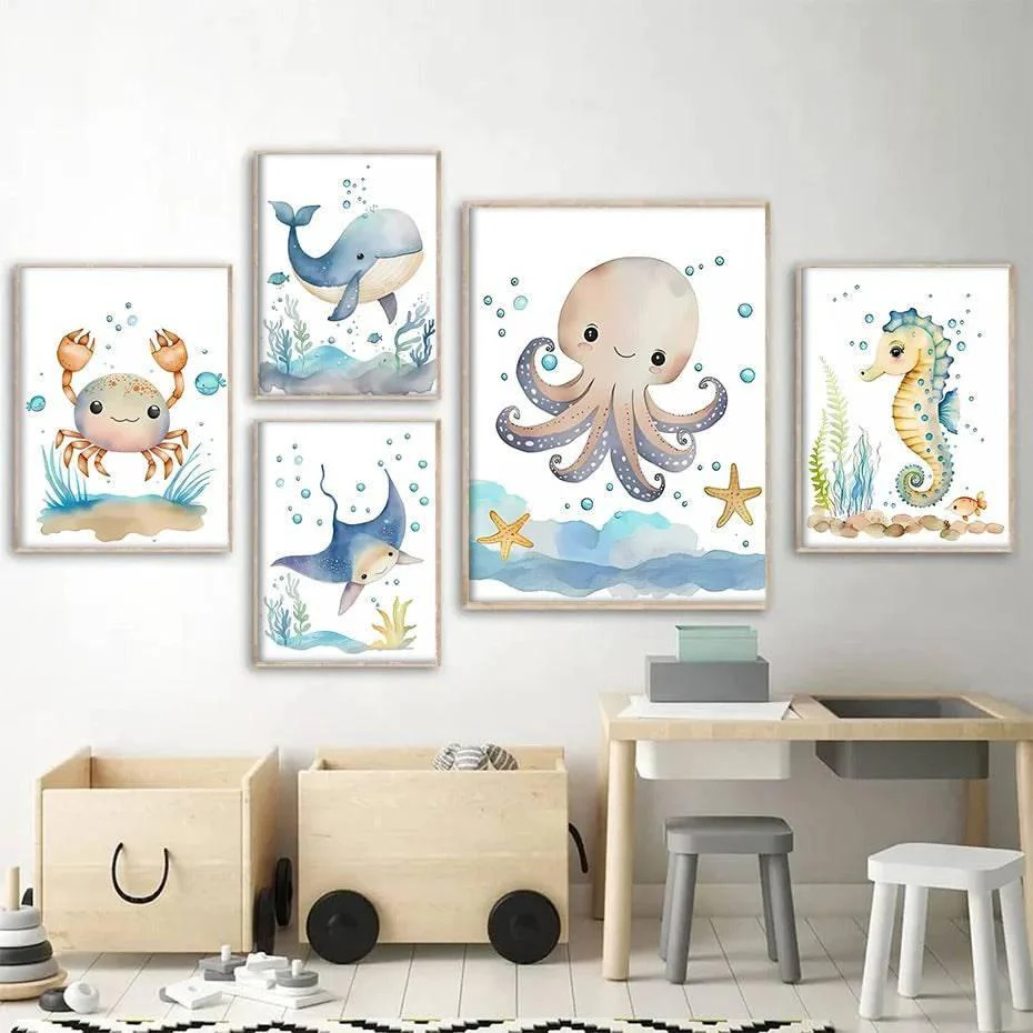 Plongez dans un univers enchanteur et apaisant pour la chambre de votre enfant avec cette série d’affiches captivantes représentant des animaux marins adorés : la Baleine majestueuse, l’Hippocampe délicat, le Poulpe espiègle, le Crabe curieux et la Tortue sage. Chaque illustration a été soigneusement conçue pour éveiller l’imaginaire tout en apportant douceur et sérénité à l’environnement de votre bébé.