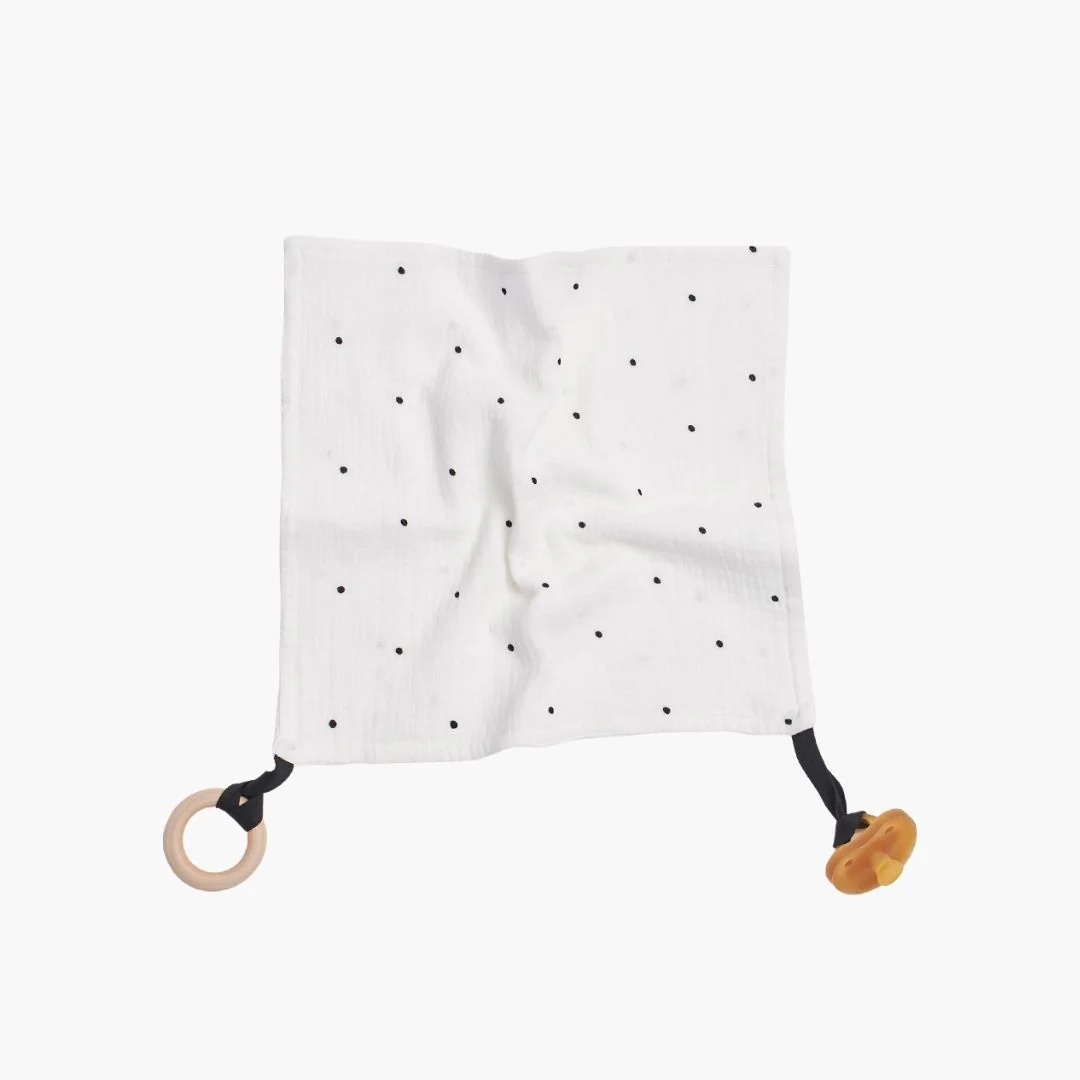 Le doudou et attache tétine Dots est parfait pour les petites mains. Il développe le sens du toucher et rassure bébé.