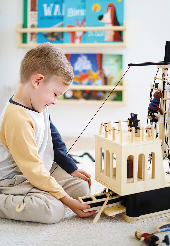 Le grand bateau de jeu pirate en bois dispose de mâts amovibles, beaucoup de rangements dans le ventre du bateau et de voiles mobiles