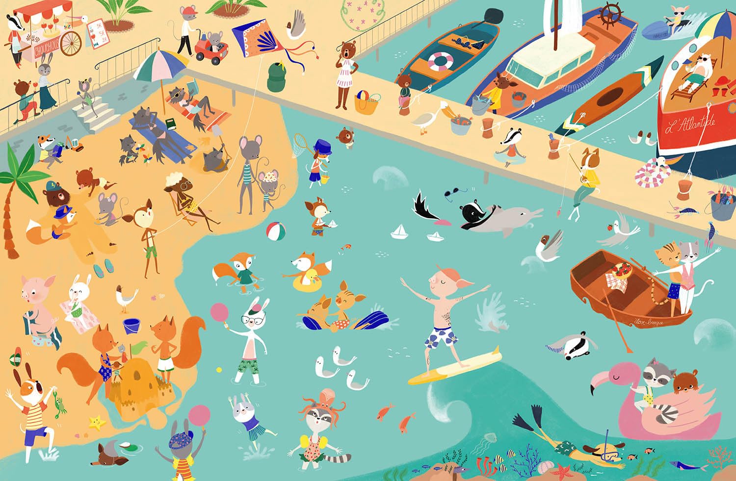 On retrouve de grandes illustrations qui fourmillent de détails pour offrir aux jeunes lecteurs un moment de jeu et d’observation à la manière d’un cherche et trouve, mais aussi des univers et des personnages récurrents pour se raconter tout un tas d’histoires en famille !