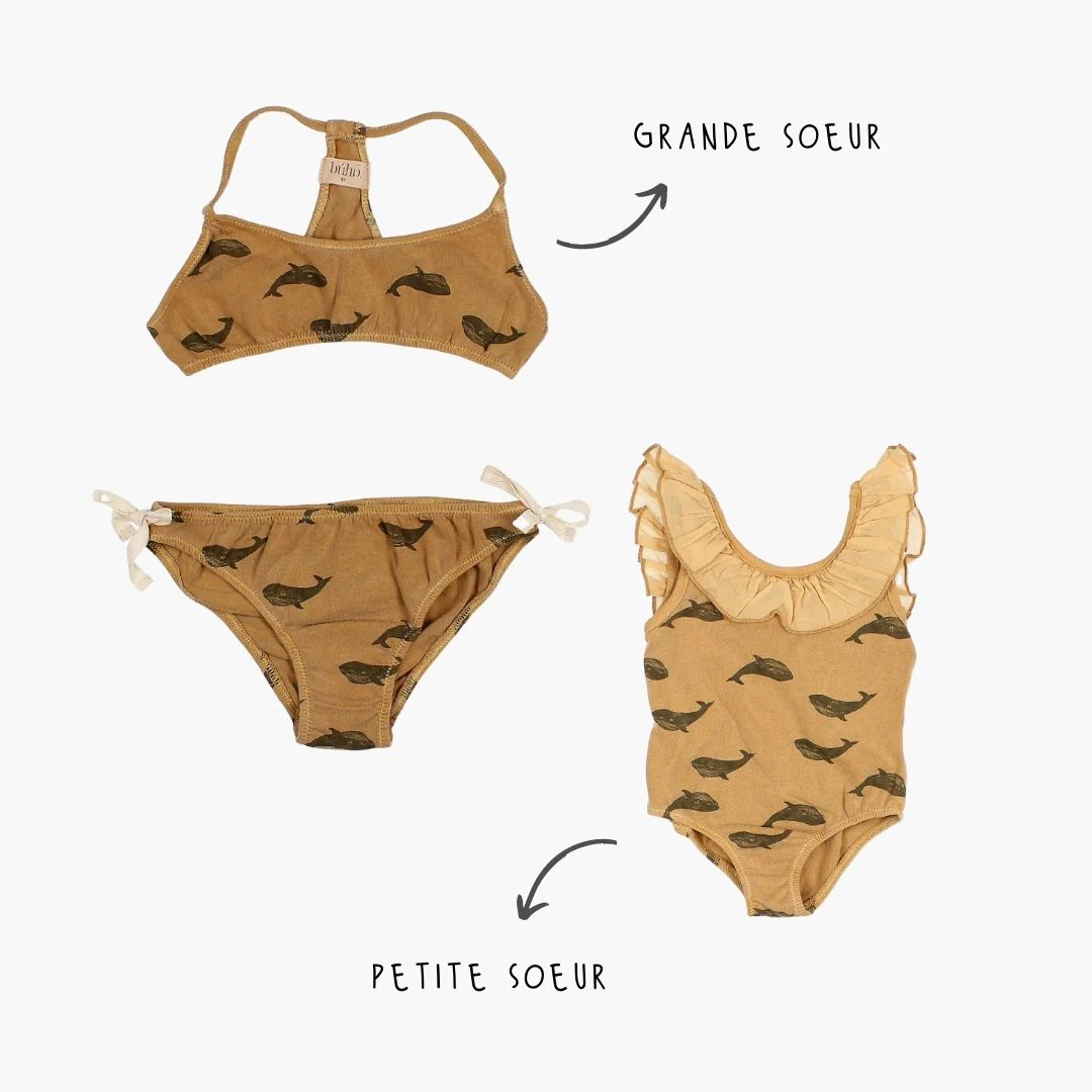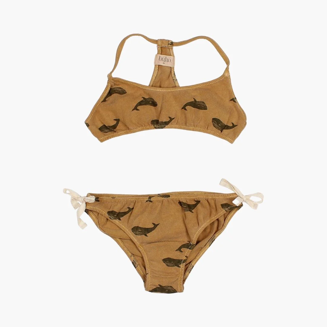 Bikini de plage imprimé baleine. On craque complètement pour cette collection de maillots Buho made in Espagne et la possibilité de réaliser des assortis frère(s) et soeur(s) sublimes pour l’été! Ce modèle taille très petit, nous vous conseillons de prendre une taille au dessus de la taille habituelle! 100% Coton Bio. Moutarde. Búho