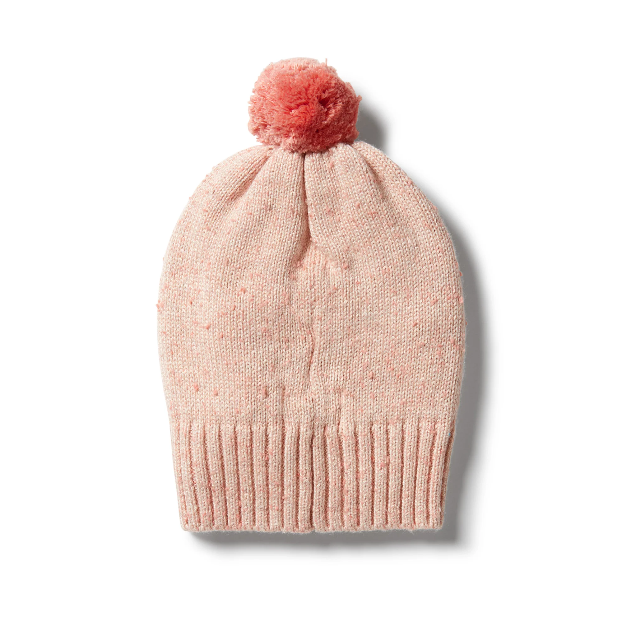 Mettez la touche finale à la tenue de votre bébé avec ce bonnet en tricot moucheté doux à pompon de couleur contrastante, il gardera les petites têtes bien au chaud et aura l’air adorable.