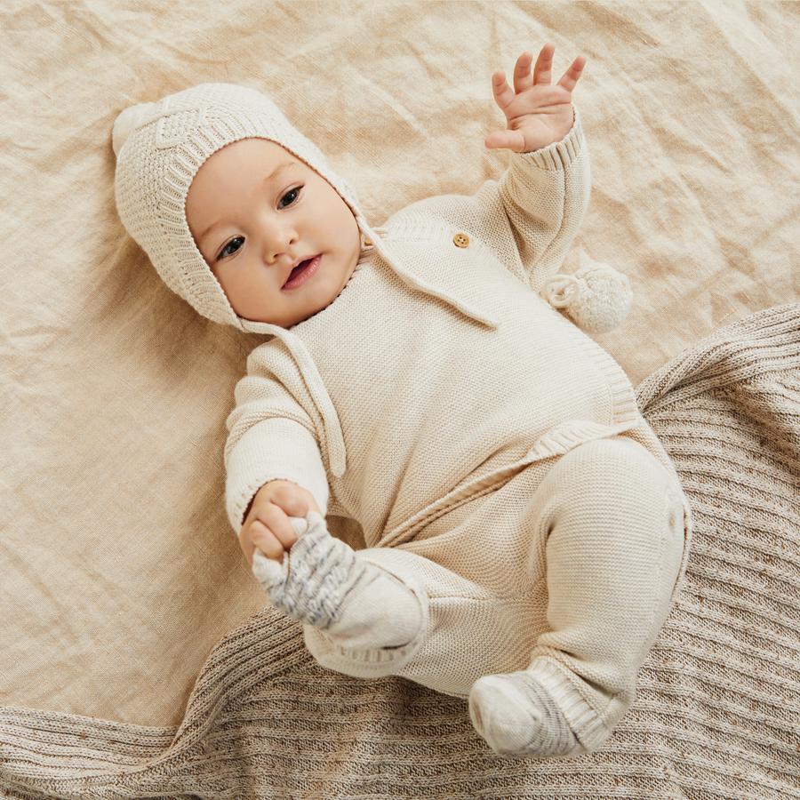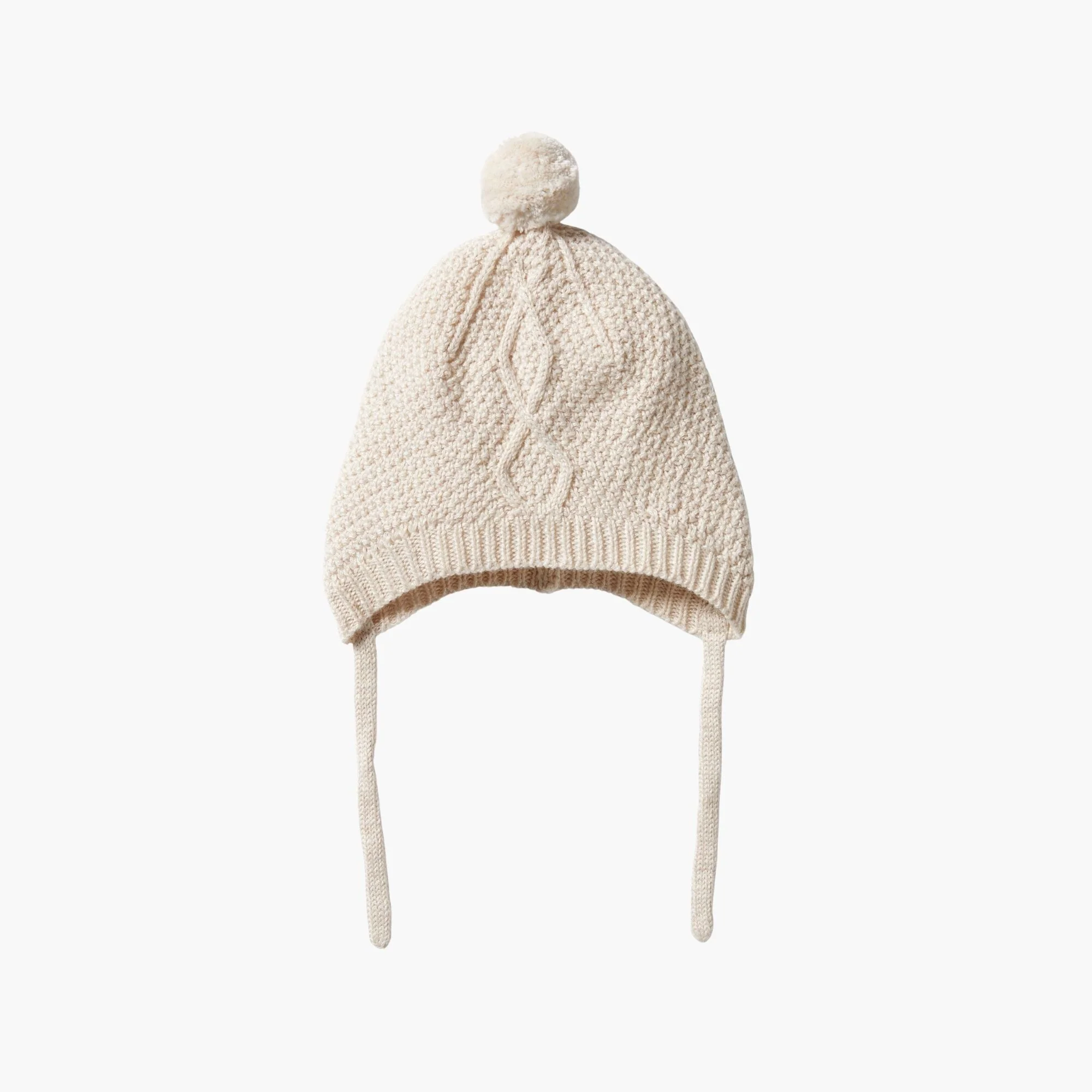 Votre bébé aura l’air adorable en portant ce joli bonnet en tricot à pompons torsadé, il se noue sous le menton et couvre bien les petites oreilles de votre bébé. 50% coton, 43% bambou, 7% laine. Wilson & Frenchy
