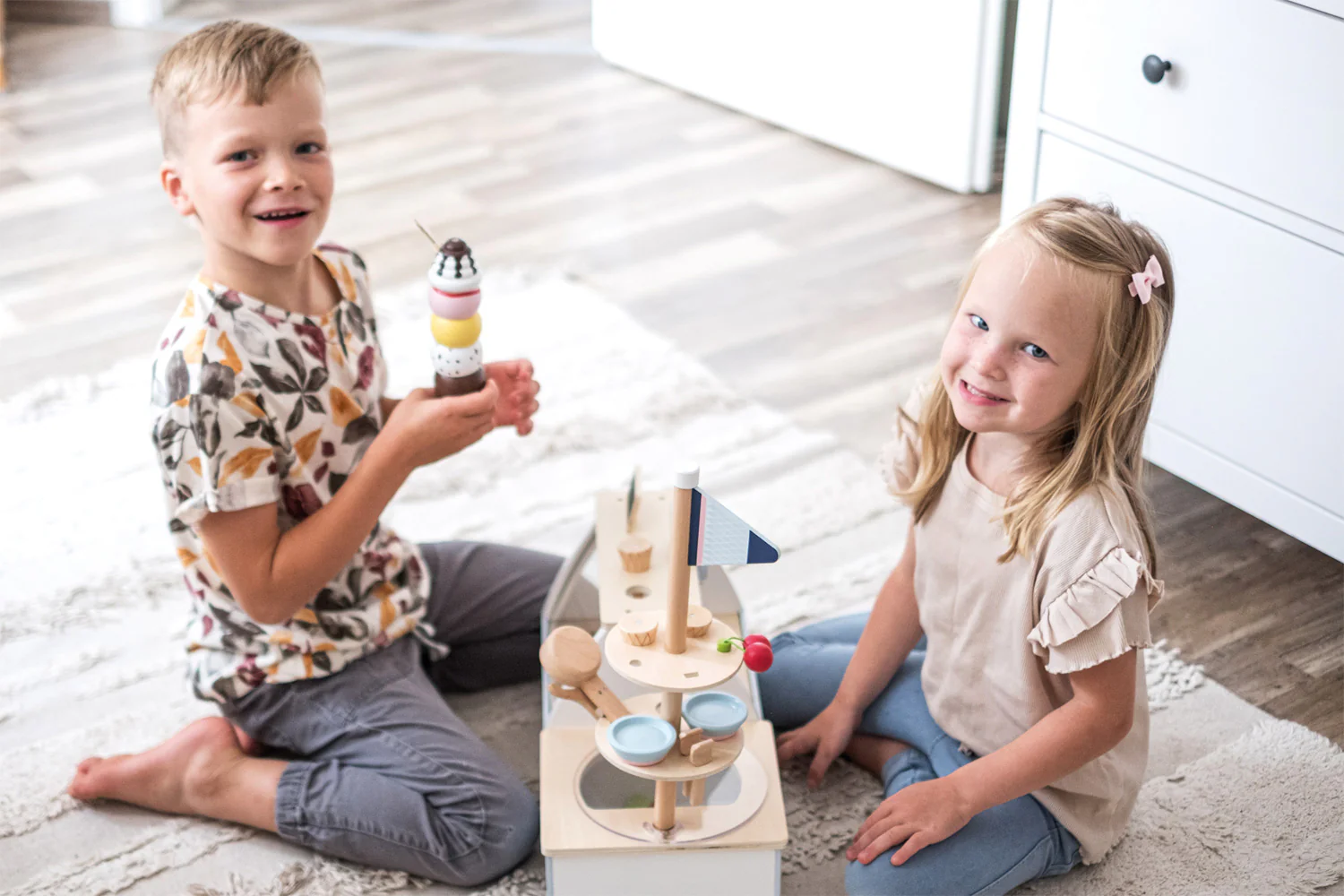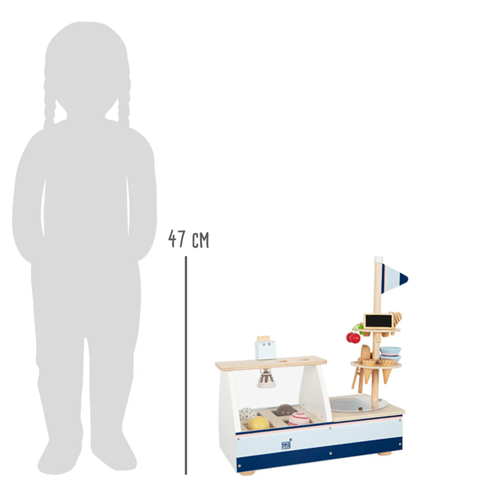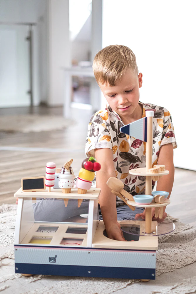 Le comptoir à glaces est un complément idéal à la cuisine de jeux, au magasin ou à l’étalage du marché et favorise les jeux de rôle actifs et l’imagination des enfants.