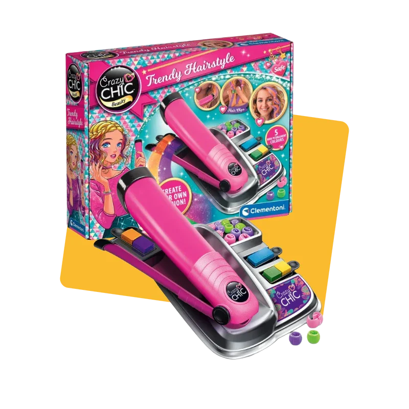 Découvrez le Kit Coiffure Trendy Crazy Chic Beauty de Clementoni, l’ensemble parfait pour les jeunes stylistes qui souhaitent exprimer leur créativité avec des cheveux multicolores ! Ce kit amusant et sûr permet de réaliser des mèches colorées sans engagement grâce à ses 5 couleurs non permanentes.