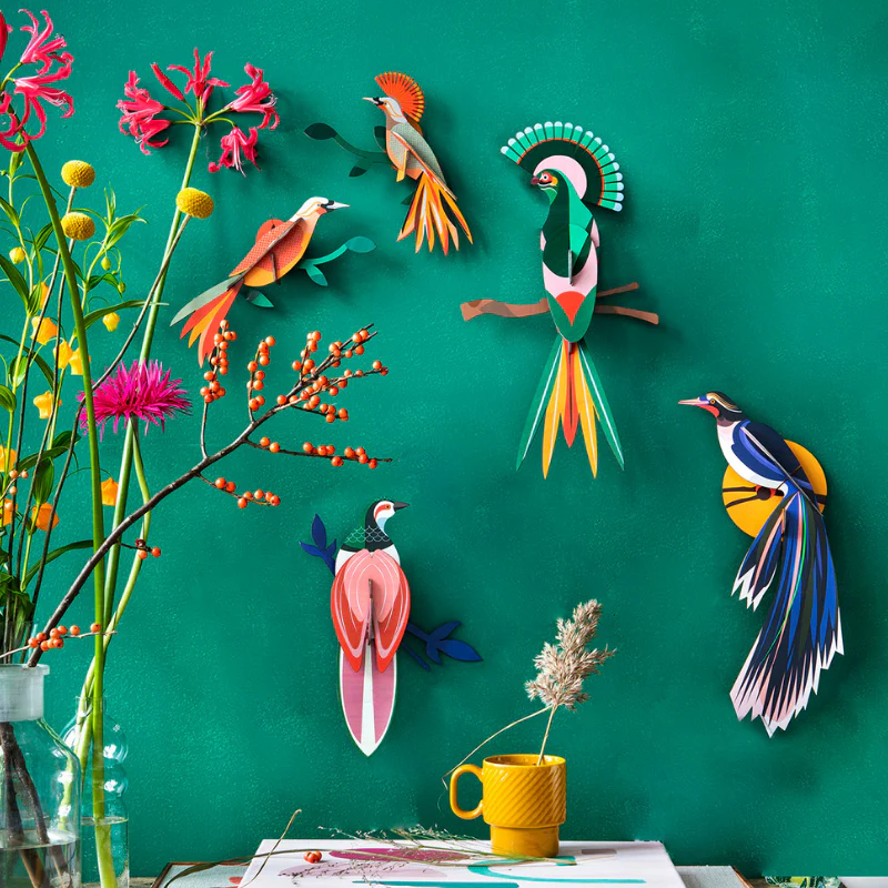Invitez la nature dans votre décoration intérieure avec cette jolie collection d’oiseaux de paradis à monter soi-même de Studio Roof. Ces sculptures 3D en carton recyclé s’invitent sur nos murs pour créer une ambiance poétique et sauvage à la fois. Grands amoureux de la nature ou petits explorateurs adoreront mettre à l’honneur ces magnifiques oiseaux aux couleurs flamboyantes dans un coin de leur salon ou de leur chambre.