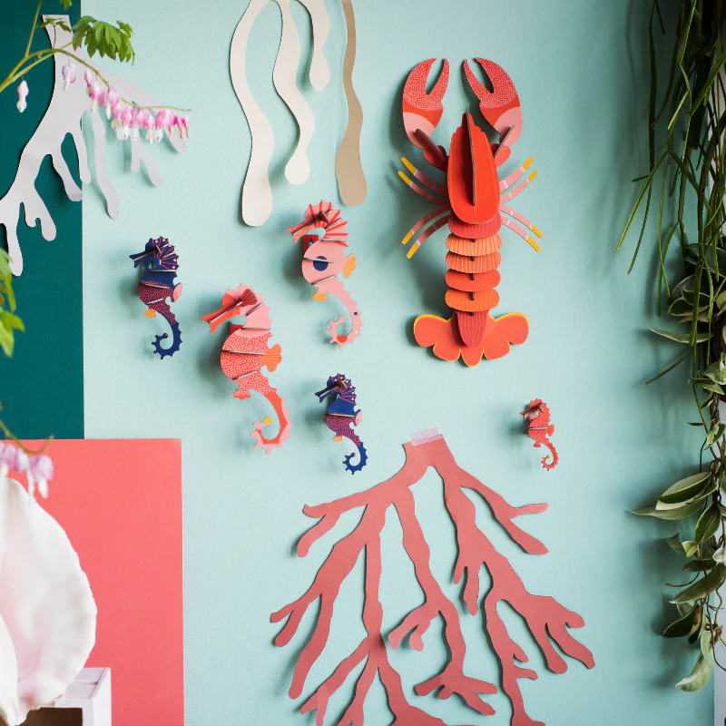 Si vous aimez la mer et ses créatures marines délicates et silencieuses, qui se cachent entre roche et corail, parmi les coquillages et les grains de sable, cette adorable famille d’hippocampes aura le plaisir de prendre place sur votre mur. Grâce à ces jolies sculptures 3D en carton recyclé, Studio Roof nous plonge sous l’océan pour nous emmener dans l’univers mystérieux des animaux marins.