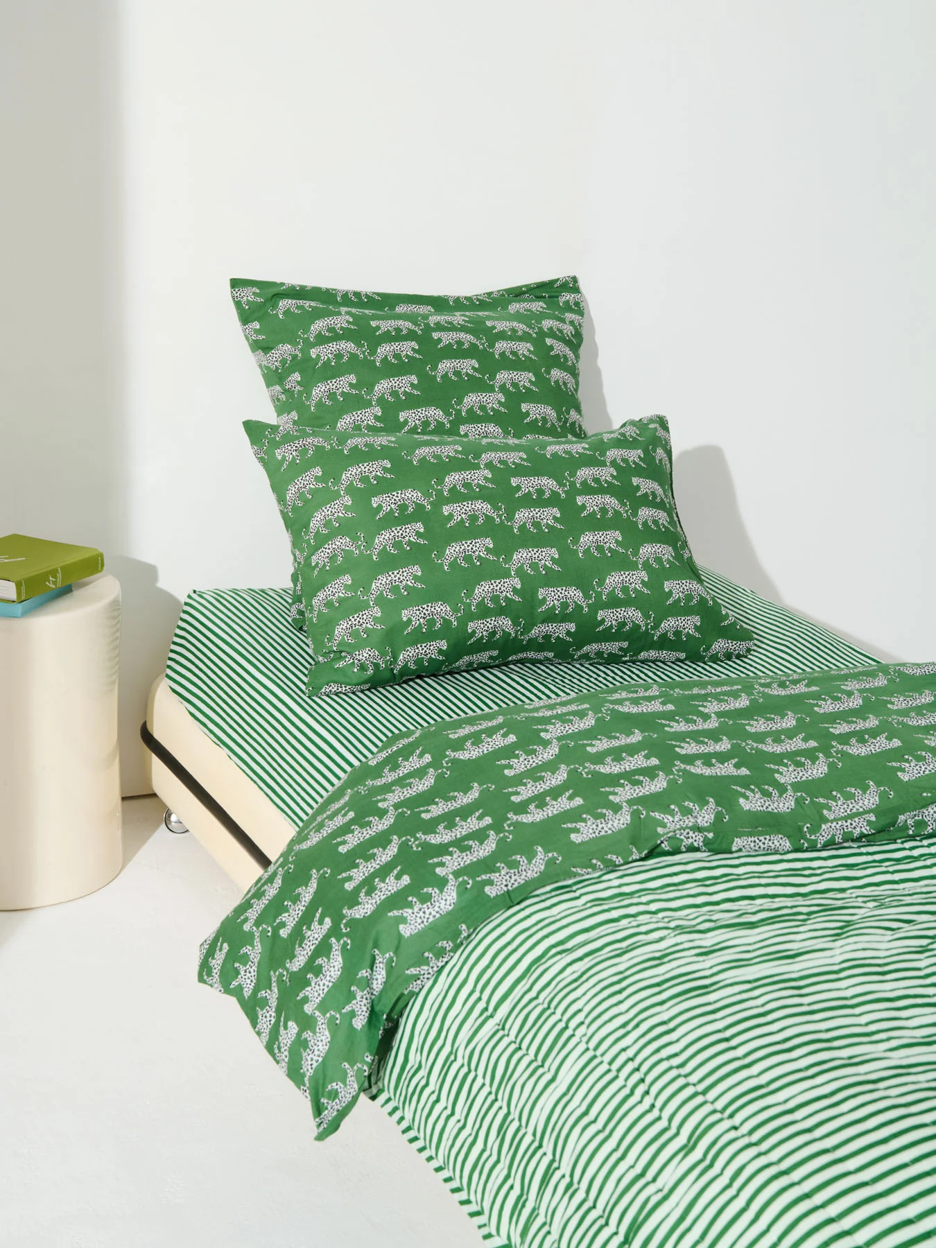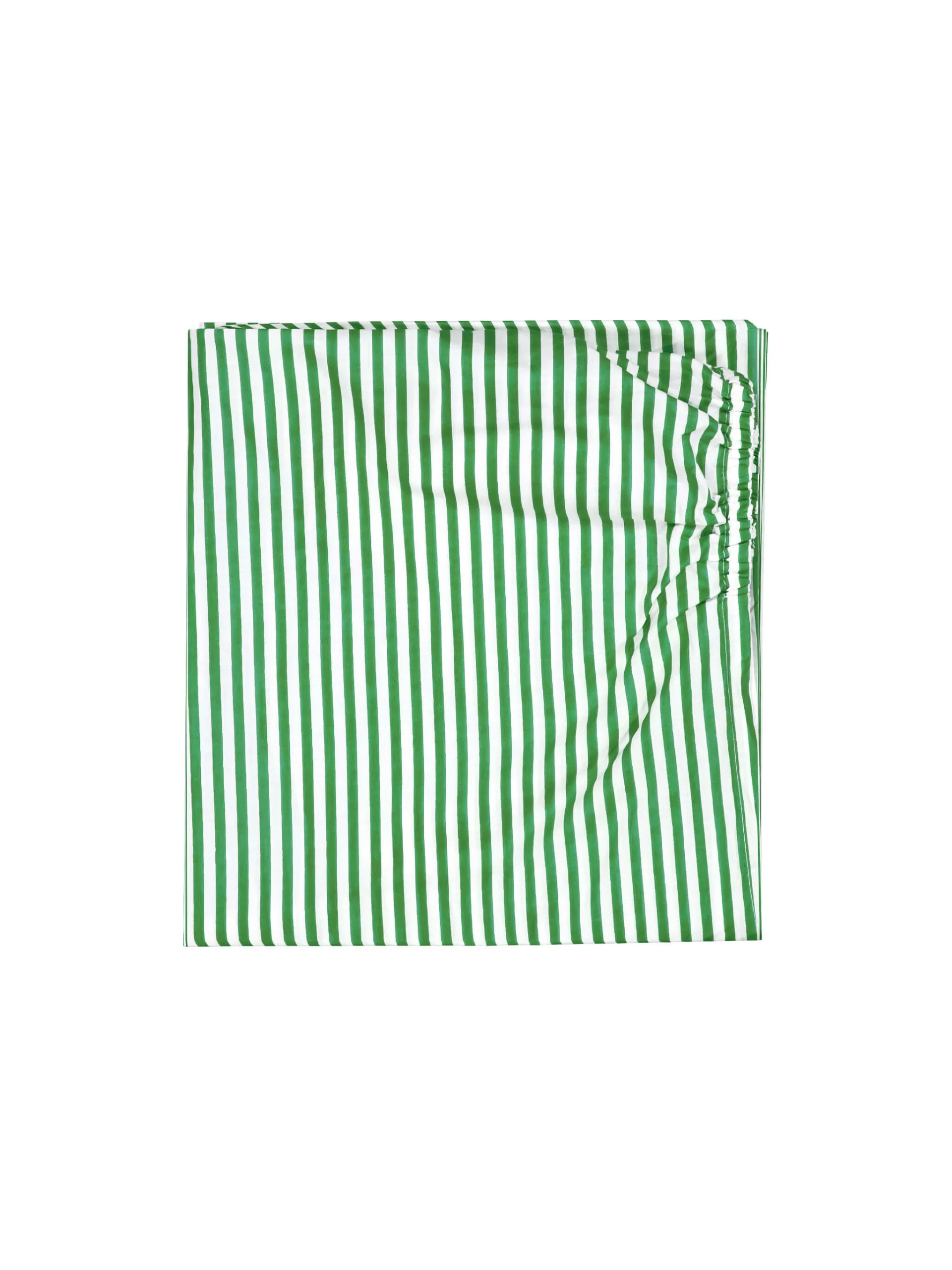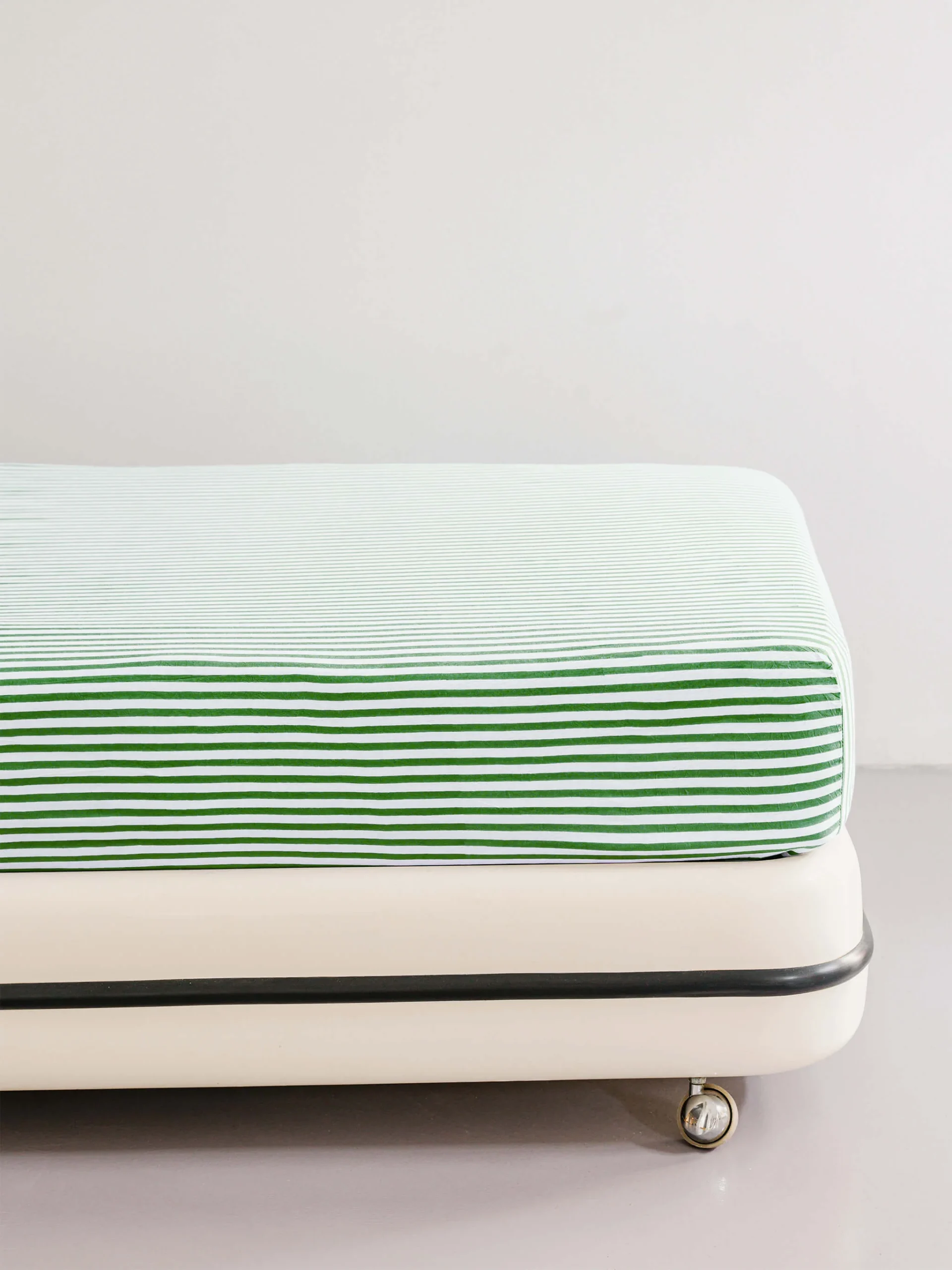 Drap housse en voile de coton léger d’une douceur à faire pâlir la percale. Motif rayé vert sur fond blanc. Imprimée à la main selon des techniques traditionnelles. Disponible en toutes tailles de lits doubles, king size et queen size. Grand bonnet et finition élastique de 30 cm.