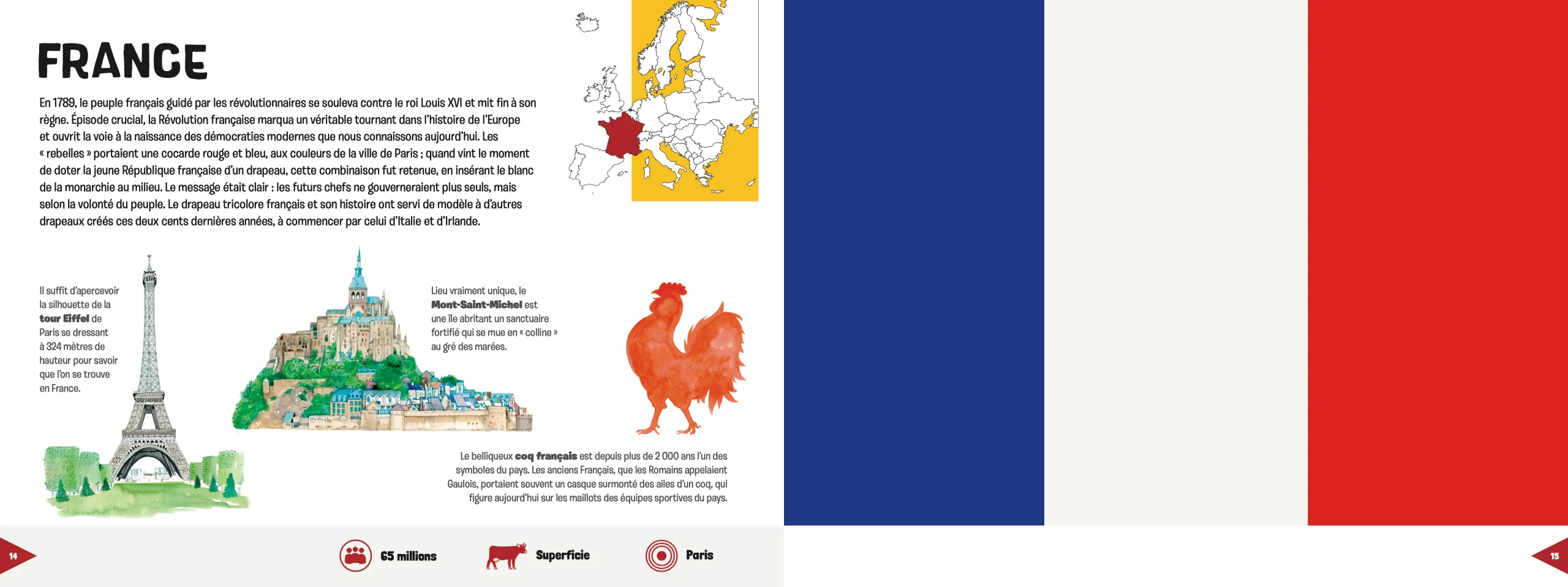 Les drapeaux représentent l’âme des nations du monde. Chaque combinaison de couleurs et de symboles a une histoire à raconter, fondée sur les expériences et les sentiments des habitants de différents pays. Connaître les drapeaux et leur langage caché est donc un moyen de comprendre l’histoire, la culture et le rôle des nations. Ce livre, divisé en continents, présente tous les drapeaux du monde en examinant de nombreuses bannières en détail, accompagnées de dessins représentant certains des lieux et des symboles les plus pertinents pour les différentes nations.