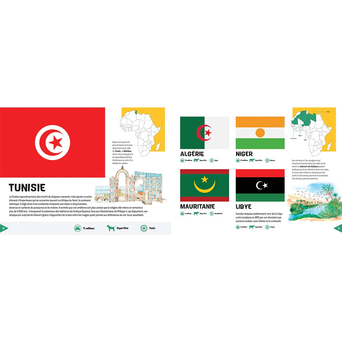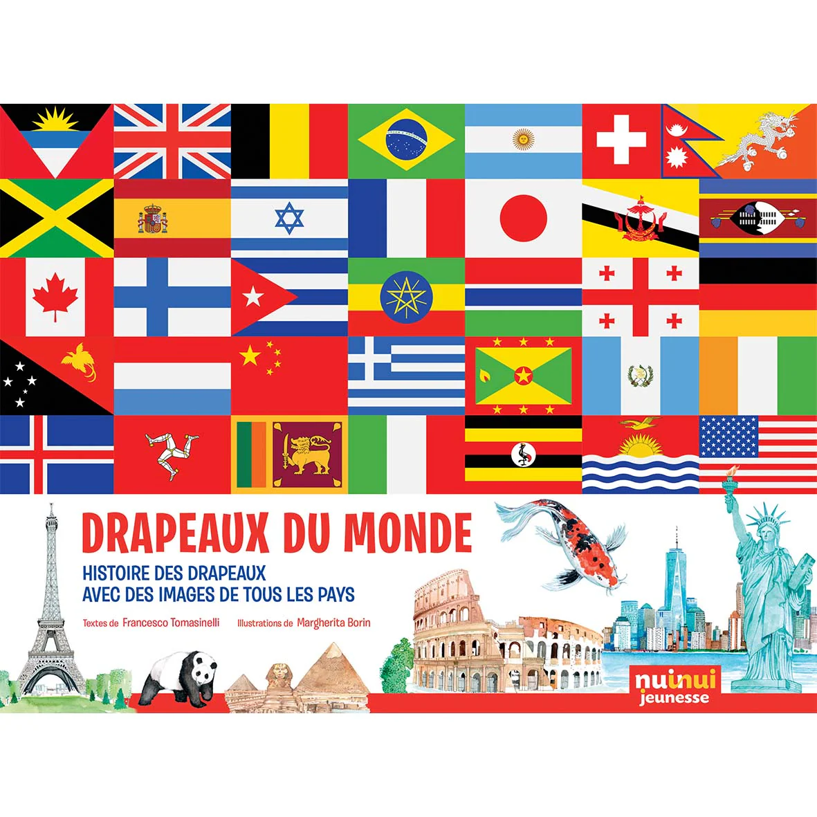Les drapeaux représentent l’âme des nations du monde. Chaque combinaison de couleurs et de symboles a une histoire à raconter, fondée sur les expériences et les sentiments des habitants de différents pays. Connaître les drapeaux et leur langage caché est donc un moyen de comprendre l’histoire, la culture et le rôle des nations. Ce livre, divisé en continents, présente en 136 pages tous les drapeaux du monde en examinant de nombreuses bannières en détail, accompagnées de dessins représentant certains des lieux et des symboles les plus pertinents pour les différentes nations.