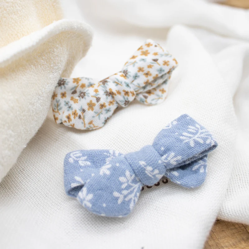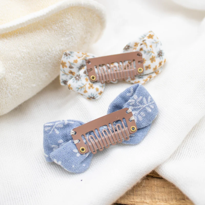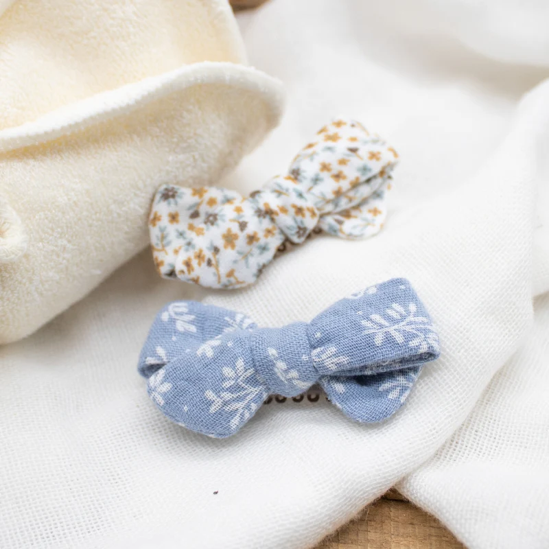 Duo de barrettes anti-glisse : branchages discrets imprimés sur double gaze moelleuse bleu associé à une explosion de petites fleurs marrons et bleus.