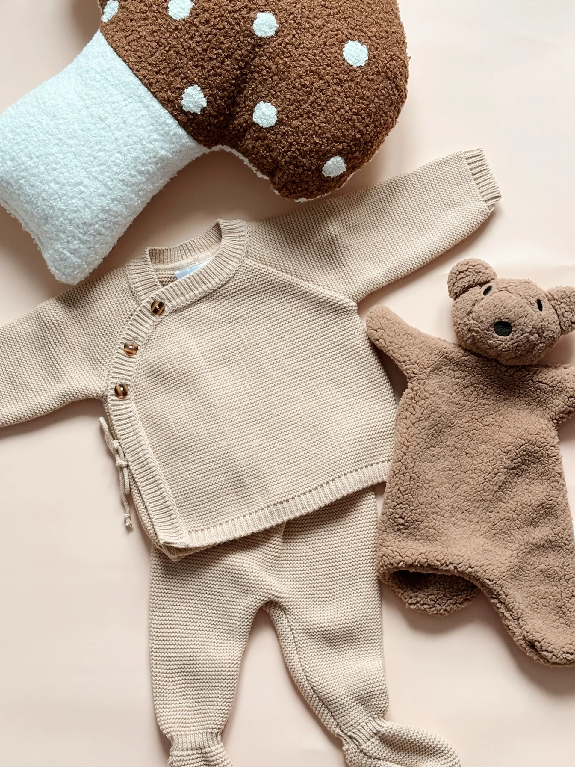 Découvrez l’adorable ensemble bébé en maille caramel de la marque Trois Kilos Sept, conçu spécialement pour les nouveau-nés (0-3 mois ).