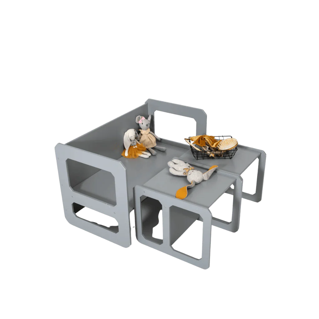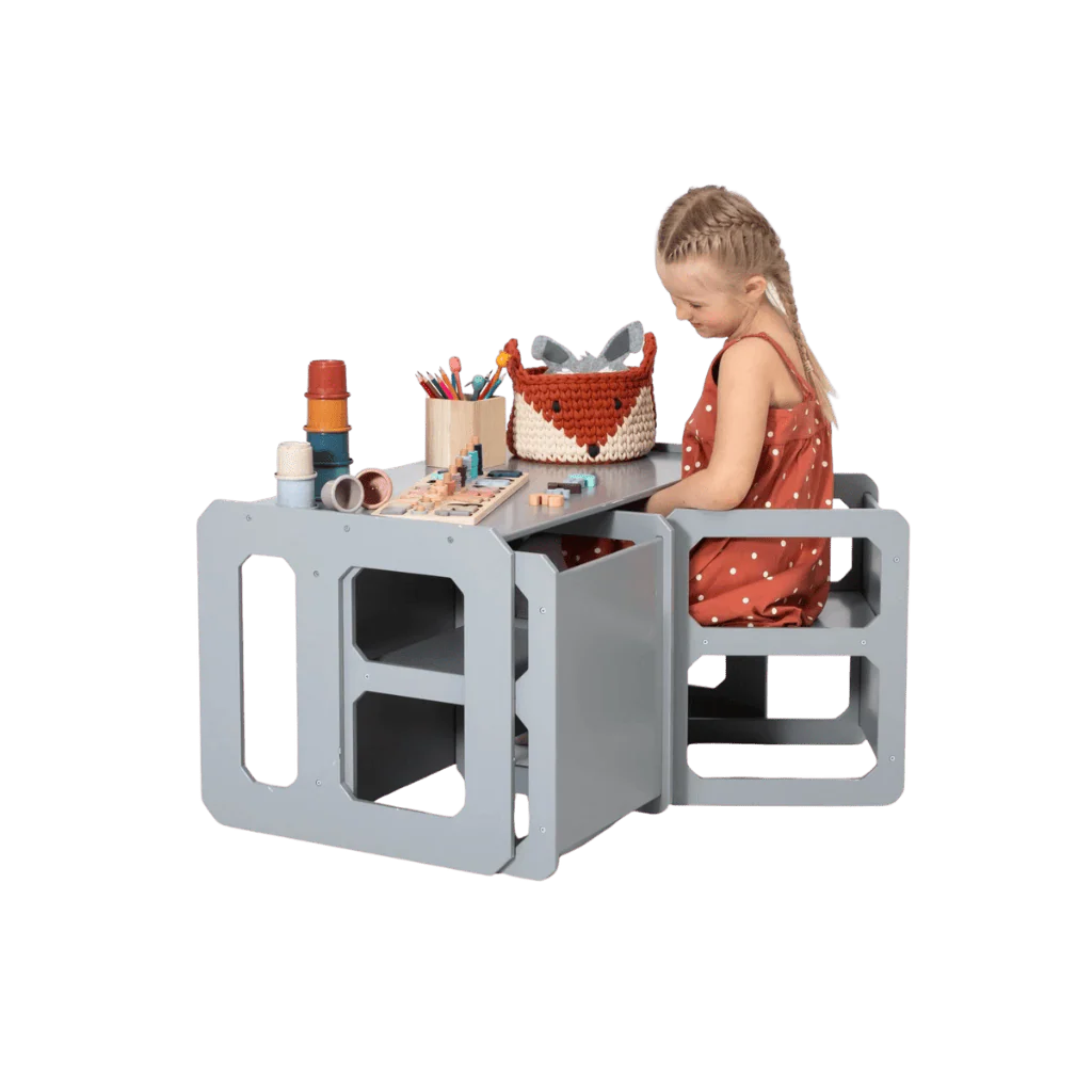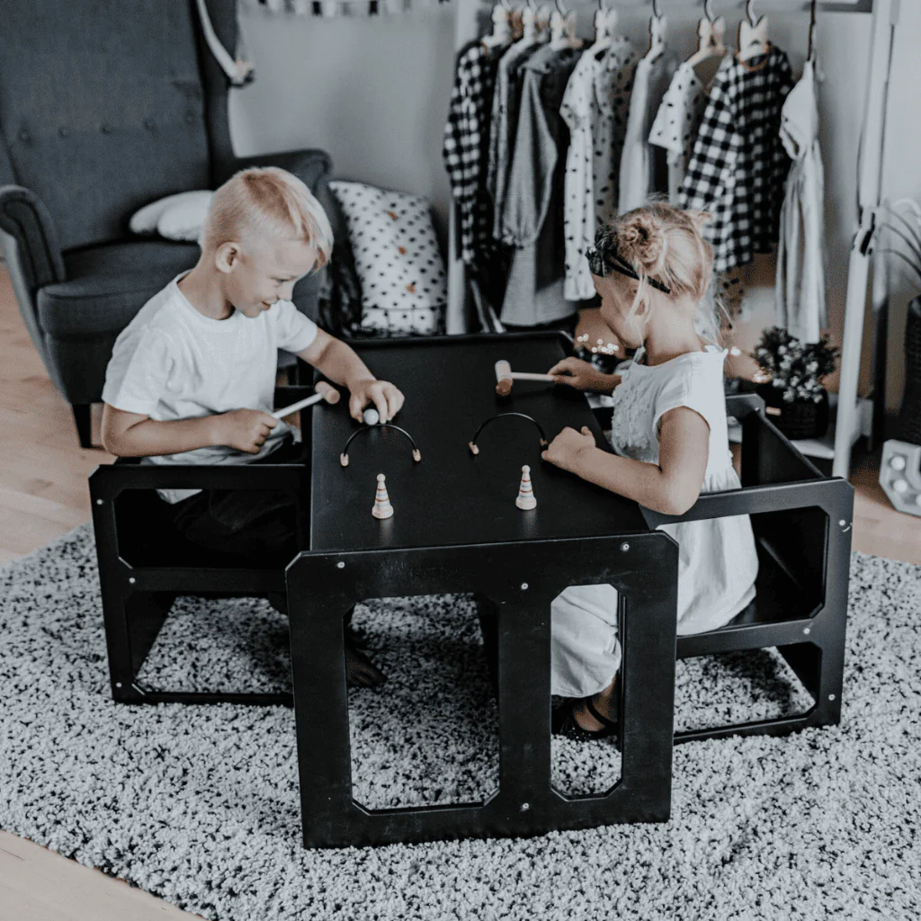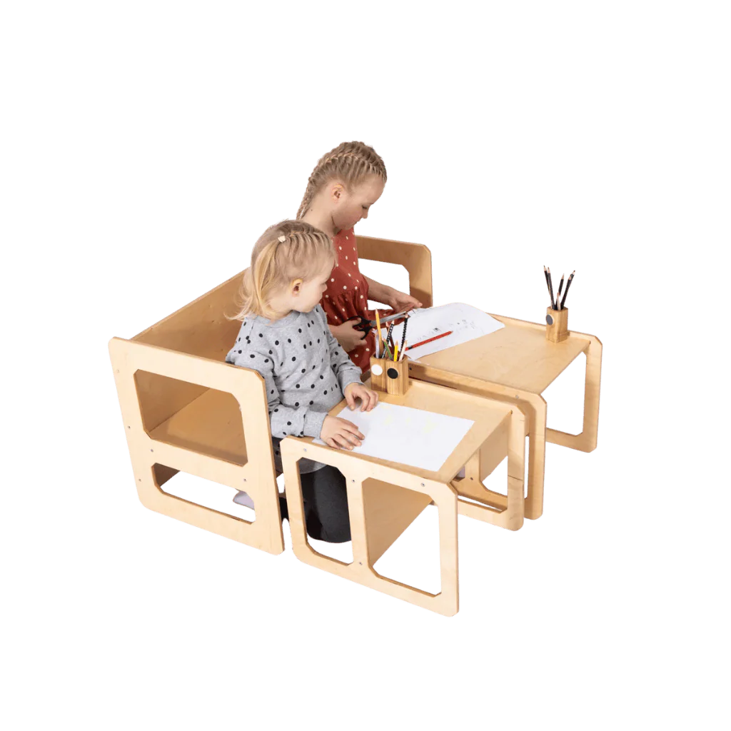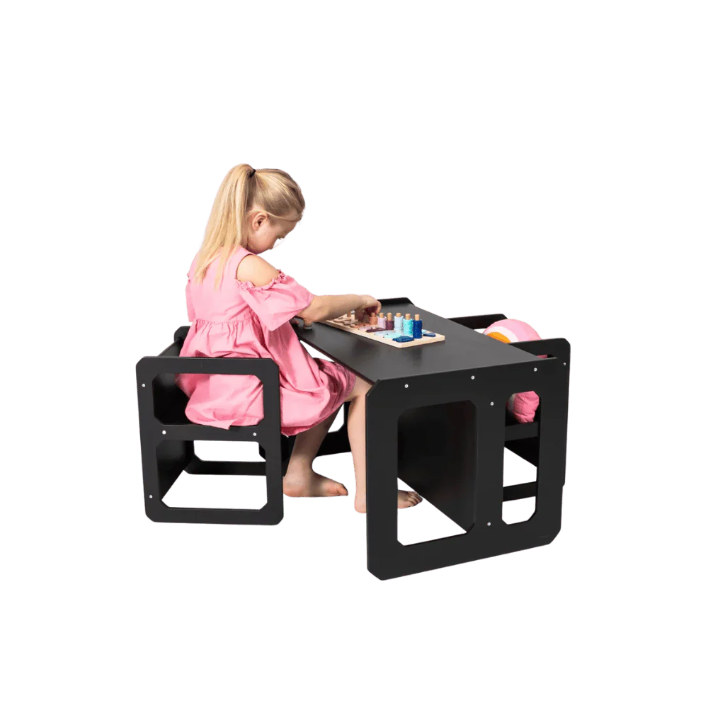 Invitez votre enfant à découvrir le plaisir de manger, jouer et apprendre en toute indépendance grâce à ce magnifique ensemble artisanal table et chaise Montessori.