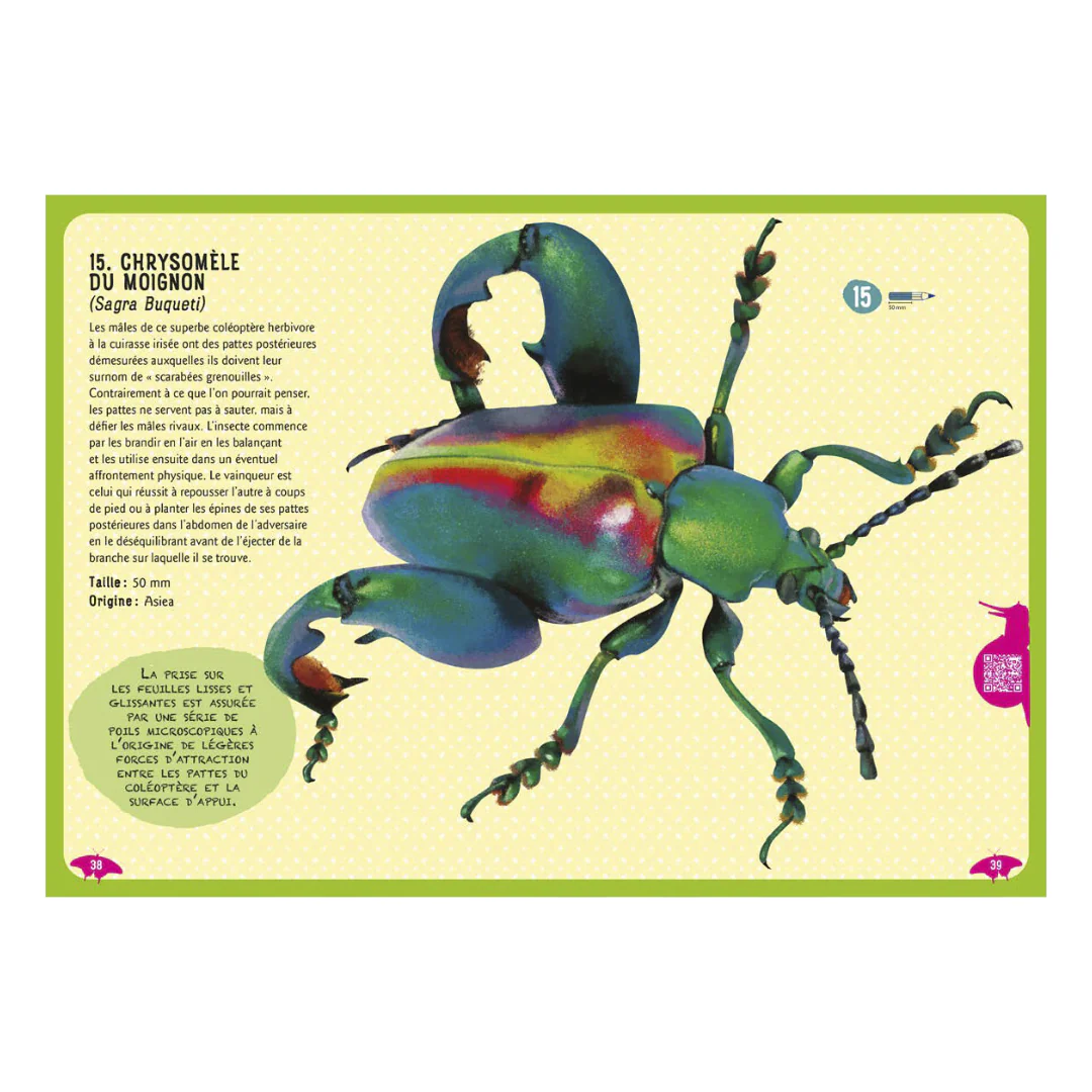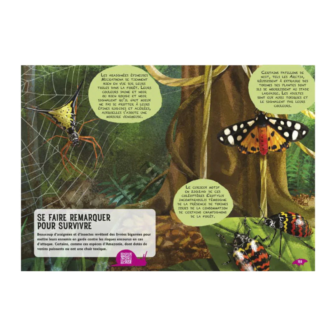 Ce guide pratique fourmillant d’illustrations colorées, de paysages merveilleux et d’anecdotes, invite à découvrir les insectes du monde et leurs habitats. Un voyage pour apprendre à connaître les espèces d’insectes les plus courantes et leurs proches parents : araignées, scorpions, mille-pattes et bien d’autres, avec leur habitudes et leur mode de vie. Plus de 250 illustrations accompagnées de textes simples mais riches en informations exposent les caractéristiques majeures des principales espèces, leurs différentes façons de chasser, de se battre, de se déplacer ; des reconstitutions précises de leurs habitats révèlent l’incroyable beauté de la nature. Les vidéos sélectionnées sur YouTube, également accessibles par code QR, entraînent les lecteurs dans une formidable aventure pour observer les insectes dans leur environnement.