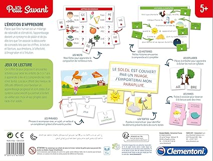 Le Jeux de Lecture de Clémentoni est un jeu éducatif conçu pour aider les enfants à développer leurs compétences en lecture de manière ludique et interactive. Grâce à des cartes illustrées et des exercices progressifs, les tout-petits découvrent les lettres, les syllabes, les mots et les premières phrases, tout en stimulant leur curiosité et leur envie d’apprendre.