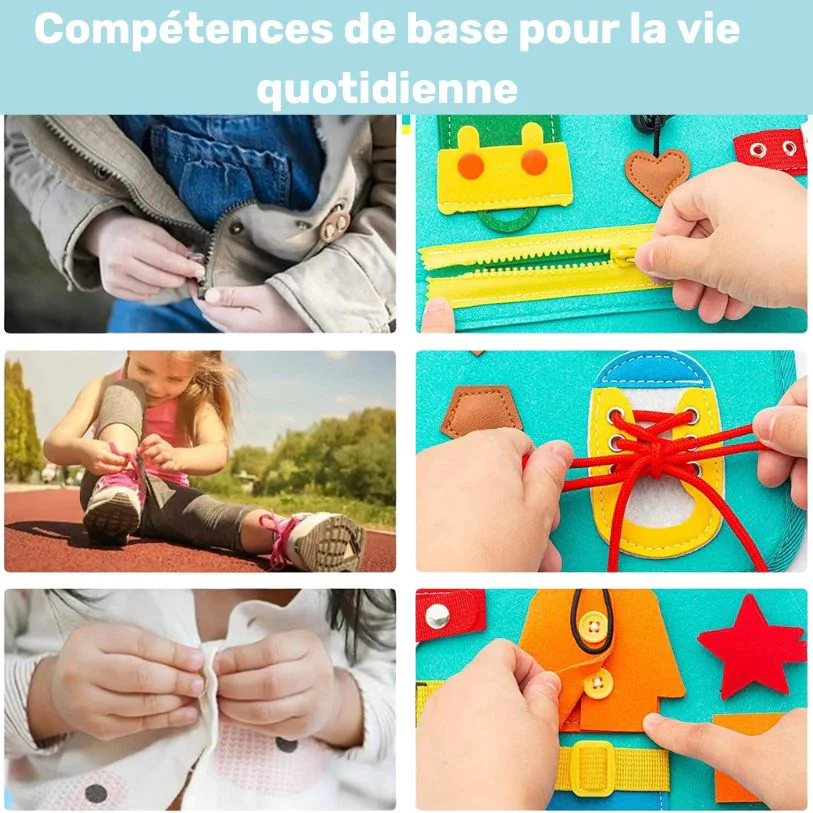 Notre kit sensoriel 7-en-1 Montessori est conçu pour enseigner aux enfants des compétences pratiques essentielles telles que le boutonnage et le laçage, leur permettant ainsi de devenir autonomes dans leurs activités quotidiennes.