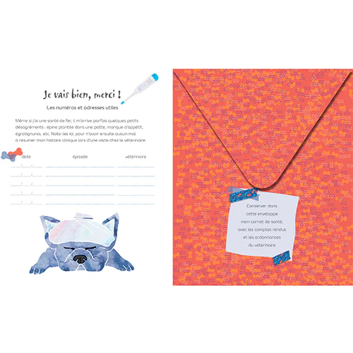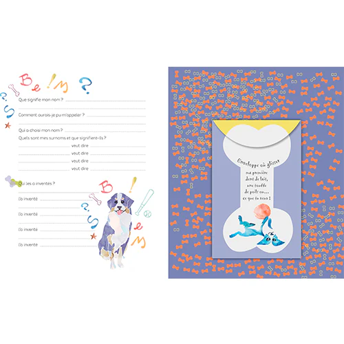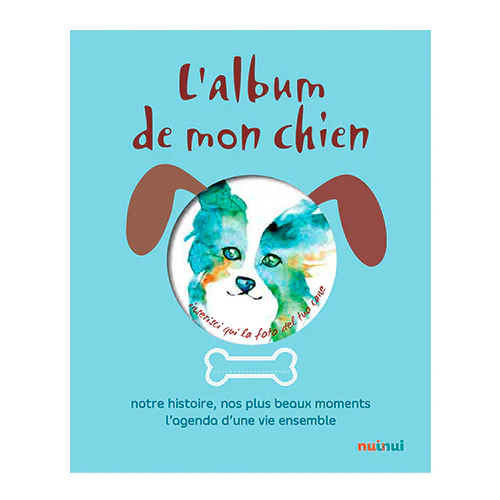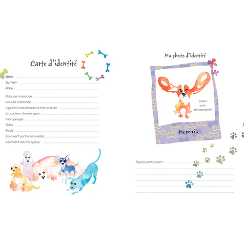Les propriétaires de chiens trouveront dans cet album d’amusants dessins à l’aquarelle retraçant les plus grands moments de la vie de leurs fidèles compagnons à quatre pattes : la famille d’origine et l’arrivée dans la nouvelle maison, les jeux et les divertissements préférés, les petites habitudes et les catastrophes domestiques. Photographies et souvenirs s’inséreront dans les sections correspondantes, donnant naissance à un journal recomposant l’histoire du chien et constituant par ailleurs un carnet de bord très utile. Vous pourrez ainsi y noter rendez-vous et dates clés : visite chez le vétérinaire, toilettage, concours d’agility, etc.