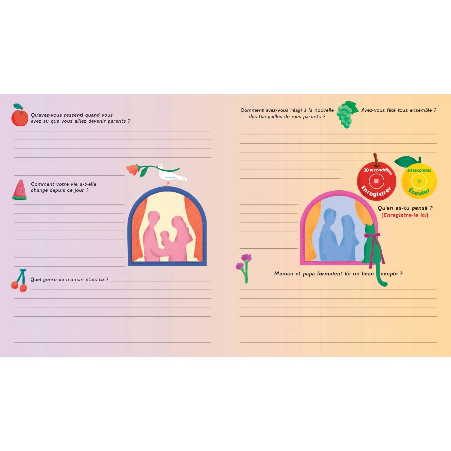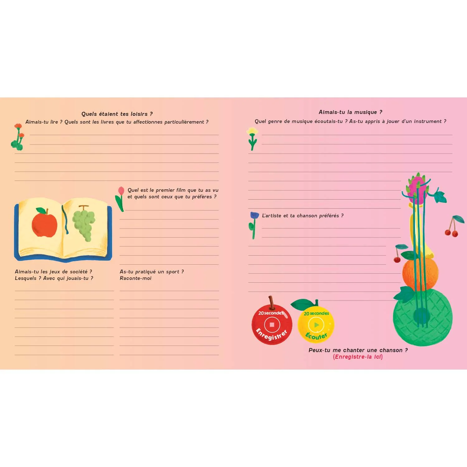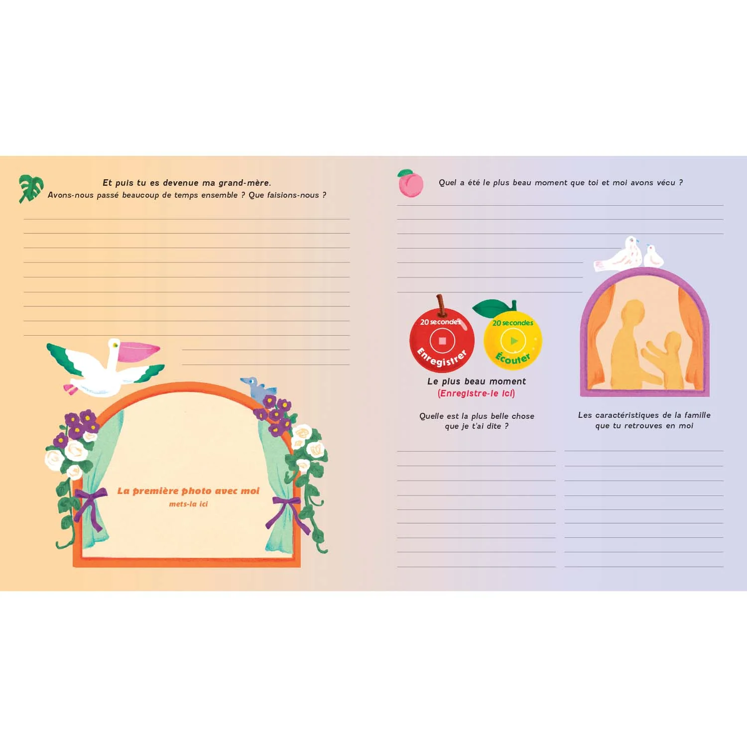 En plus de conserver des photos et des souvenirs, cet album vous permet d’enregistrer et d’écouter la voix de votre grand-mère, afin que vous puissiez vous rappeler son histoire à tout moment. En appuyant sur les boutons d’enregistrement et d’écoute situés sur les pages thématiques qui retracent les principales étapes de sa vie, vous pouvez enregistrer sa voix et la réécouter, ou choisir de couvrir l’enregistrement par un nouveau jusqu’à ce que vous obteniez le dernier. Des dessins vivants et joyeux accompagnent les différents moments de la vie de Mamie. Un petit album pratique, une idée de cadeau originale et précieuse.