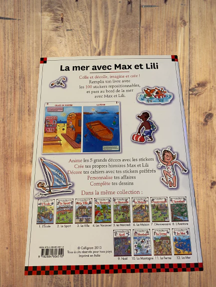 Livre activité La vie avec Max et Lili modèle « La Mer » avec 100 stickers repositionnables Avec 5 grands décors et 100 stickers repositionnables. Prix boutique: 4€99