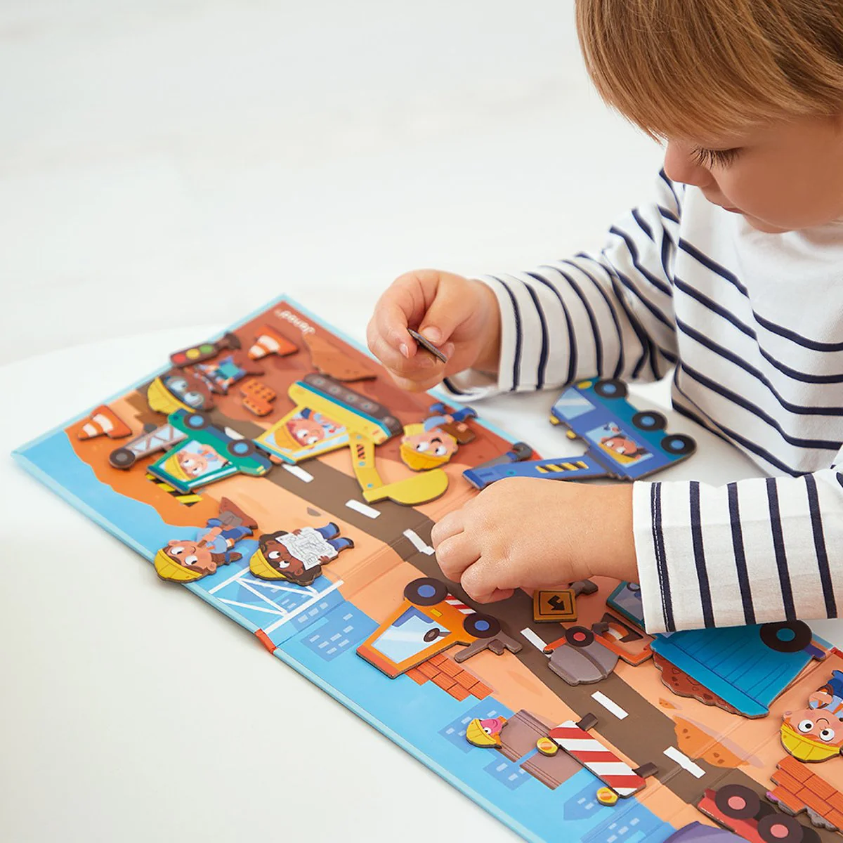Découvrez le monde du chantier avec le Magnéti’stories de Janod ! Ce livre magnétique en 3 parties stimule l’imagination des enfants dès 3 ans avec 30 magnets représentant ouvriers, engins de chantier et décor.