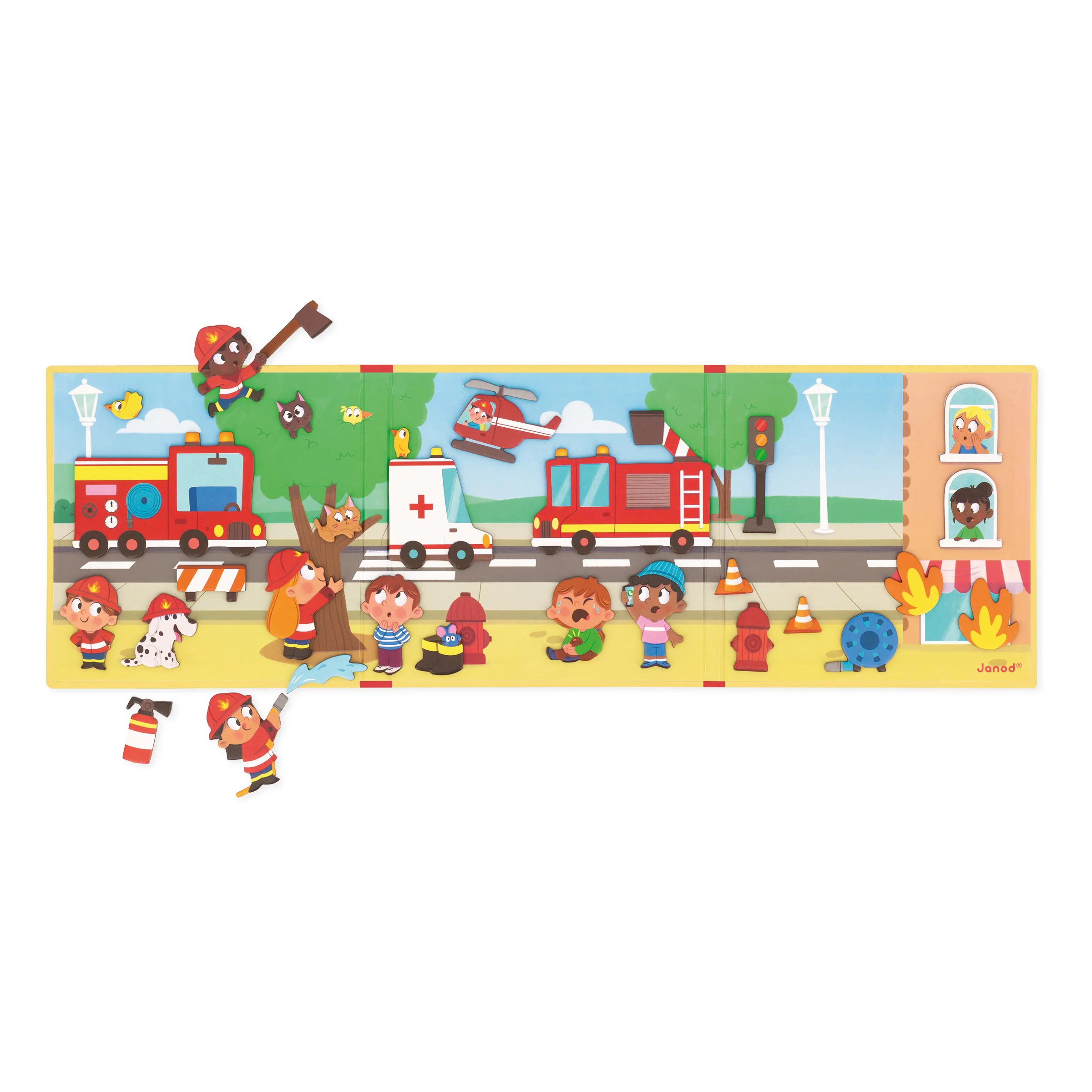 Ce jeu magnétique ravira vos enfants, les invitant à s’imaginer en vrais petits pompiers, dès l’âge de 3 ans. Ce jeu aimanté se compose d’une planche illustrée aux couleurs des soldats du feu ainsi que de 30 magnets à venir déposer sur le décor. Une fois déposés, les aimants vont peu à peu prendre vie grâce à l’imagination de votre enfant. Le petit chat se mettra à miauler et la petite fille sèchera finalement ses larmes grâce à l’intervention des pompiers !