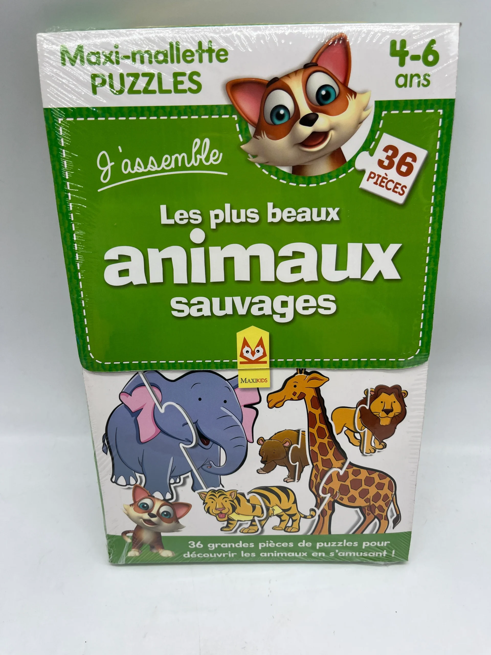 Maxi mallette coffret Puzzle j’assemble les plus beau animaux sauvages 36 grandes pièces de puzzles doubles face pour apprendre en t’amusant neuf sous blister Le coffret est sous blister Laboutiquedulivre