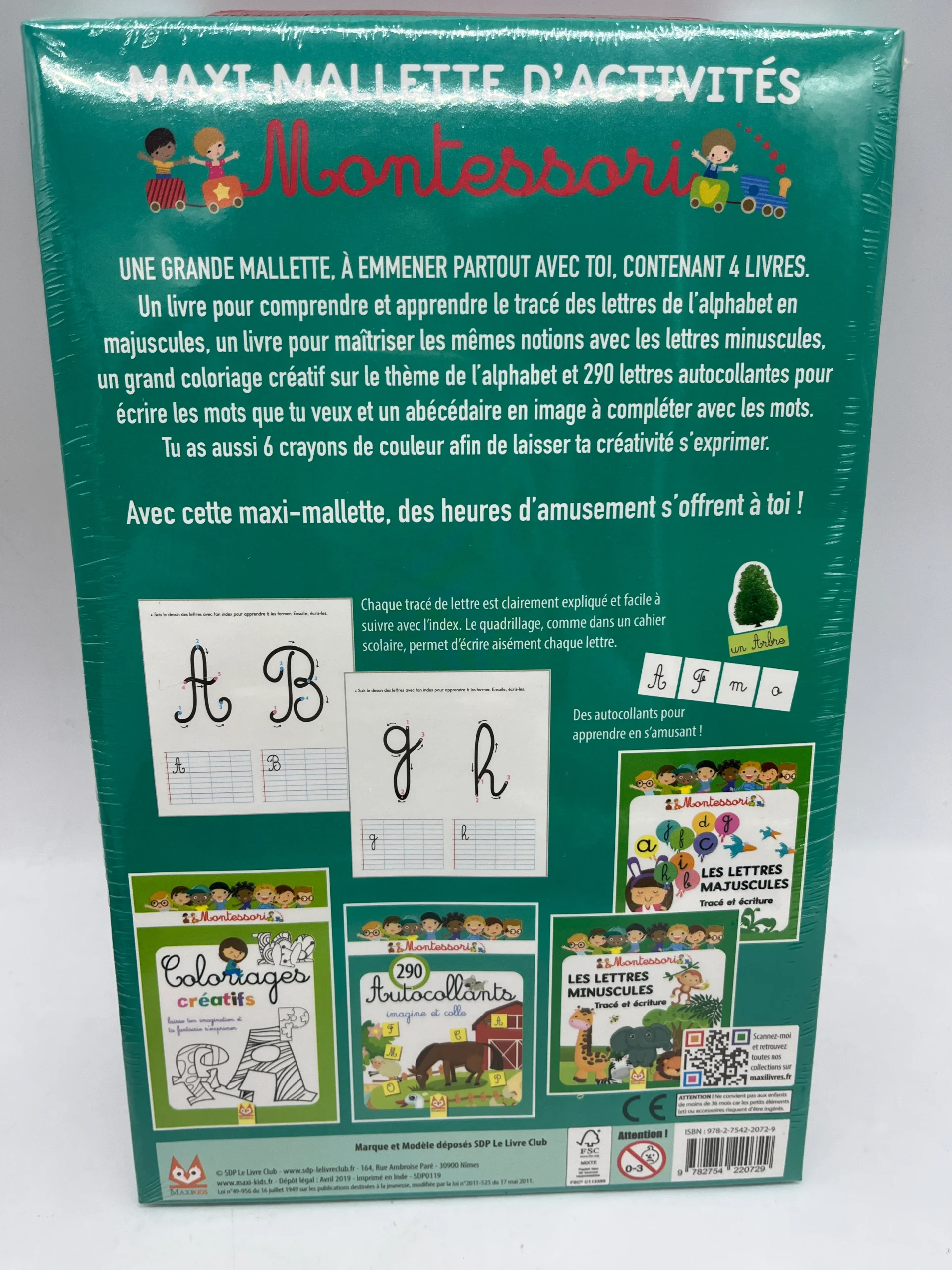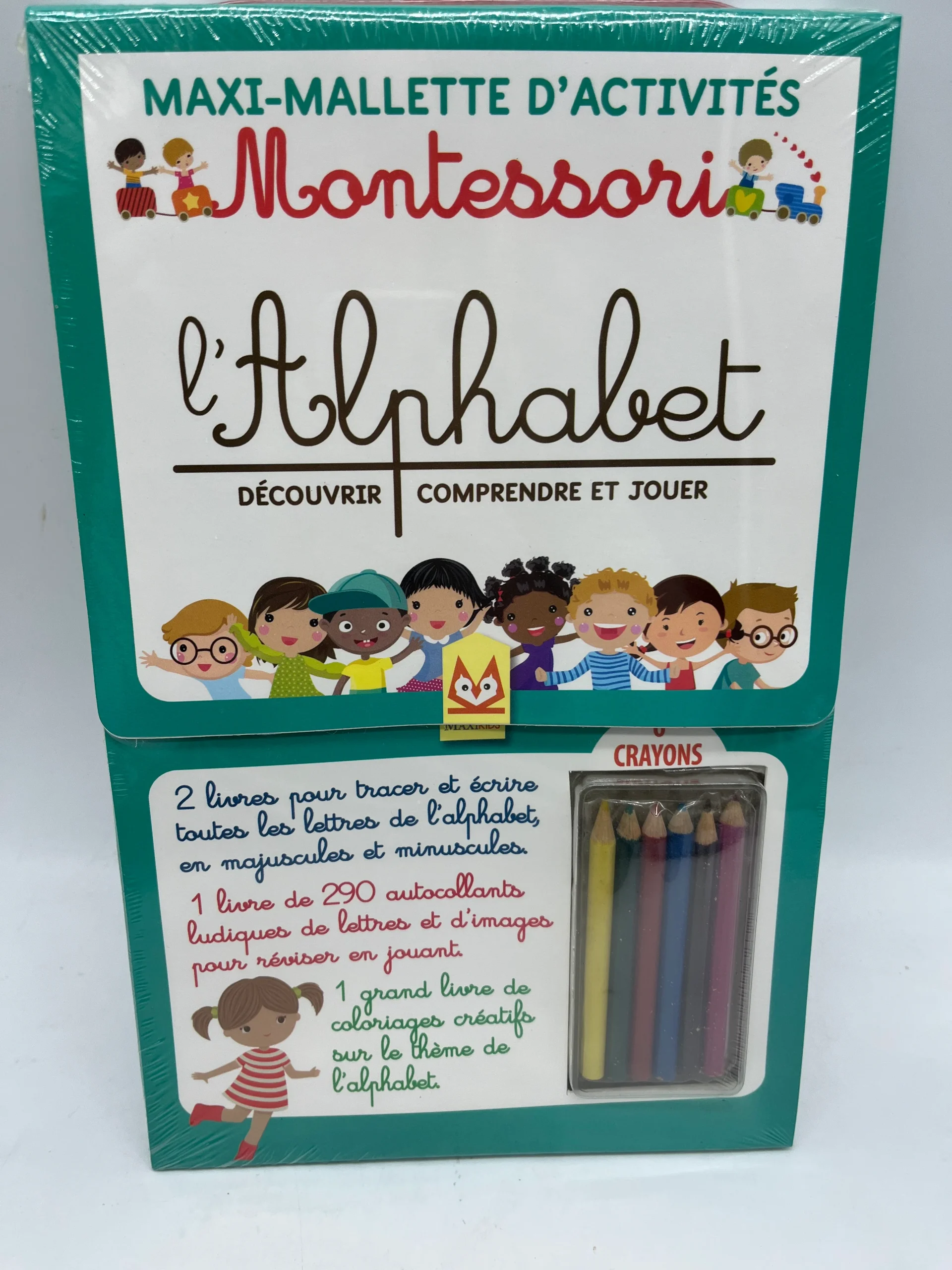 Maxi Mallette d’activités Montessori thème l’alphabet Neuf sous blister La maxi mallette contient : 2 livres imagier pour découvrir et colorier les lettres et les mots 1 livre avec 300 autocollants de lettres et de mots à associer pour réviser en t’amusant ! 1 grand livre d’apprentissage de l’alphabet neuve sous blister Laboutiquedulivre