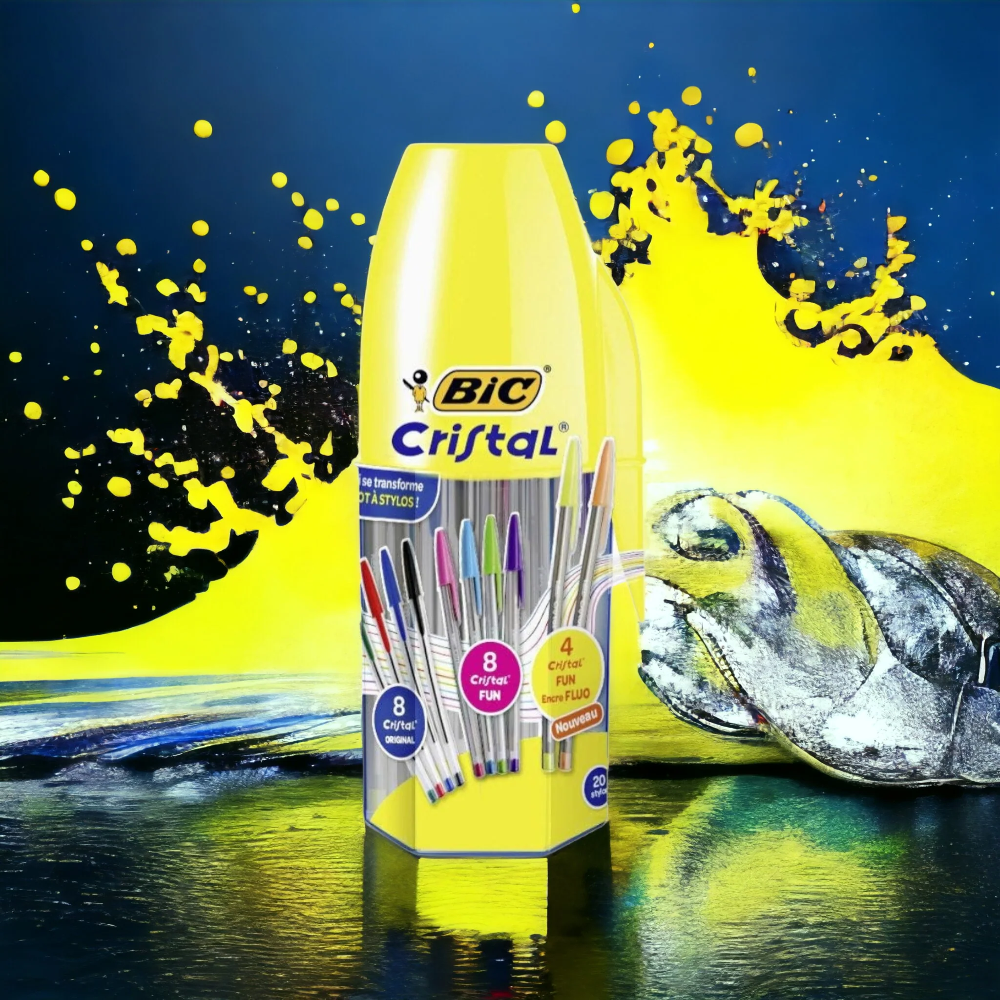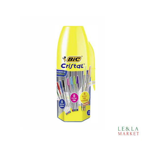Mega tubo 20 cristal multi color Bic contient: 8 stylos (noir,blue,rouge et vert) à pointe moyenne et 12 stylos fun à pointe large, dont 4 à encre fluo.