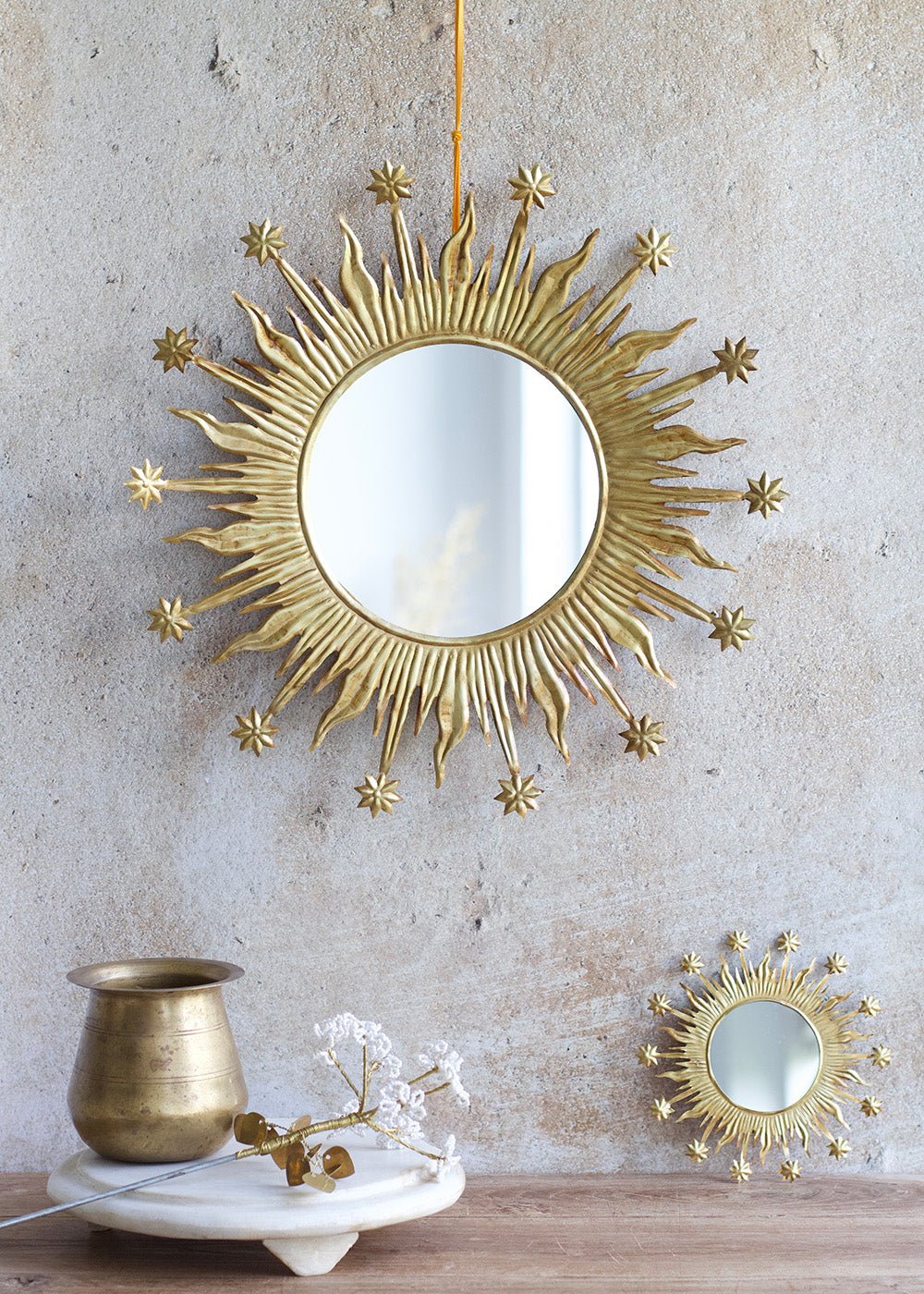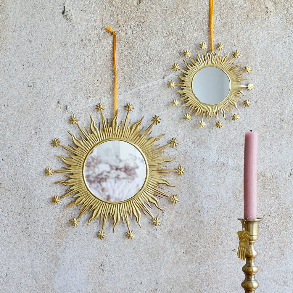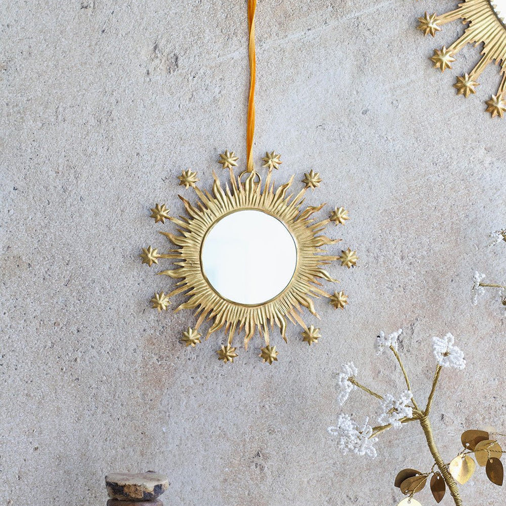 Apportez une touche de lumière et d’élégance à votre intérieur avec ce magnifique miroir doré en forme de soleil. Ce miroir soleil doré au style vintage est une pièce décorative emblématique qui sublime n’importe quel espace. Son cadre travaillé en métal doré avec ses rayons ludiques et ses délicats détails étoilés inspiré du design sunburst des années 50, diffuse une atmosphère chaleureuse et sophistiquée. Parfait dans un salon, une chambre ou une entrée, il attire le regard et capte la lumière avec éclat. Accroché seul comme pièce maîtresse ou en composition murale avec d’autres miroirs, il apporte du relief et une note chic à votre décoration intérieure.