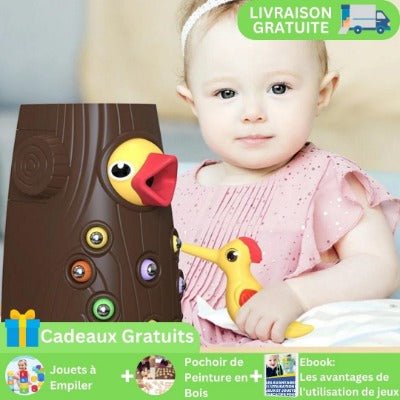 Tenez la poignée de l’oiseau et faites sortir les chenilles colorées pour les mettre dans l’arbre. Cette série d’actions améliorera la motricité fine, la capacité à résoudre les problèmes et la patience de votre enfant.