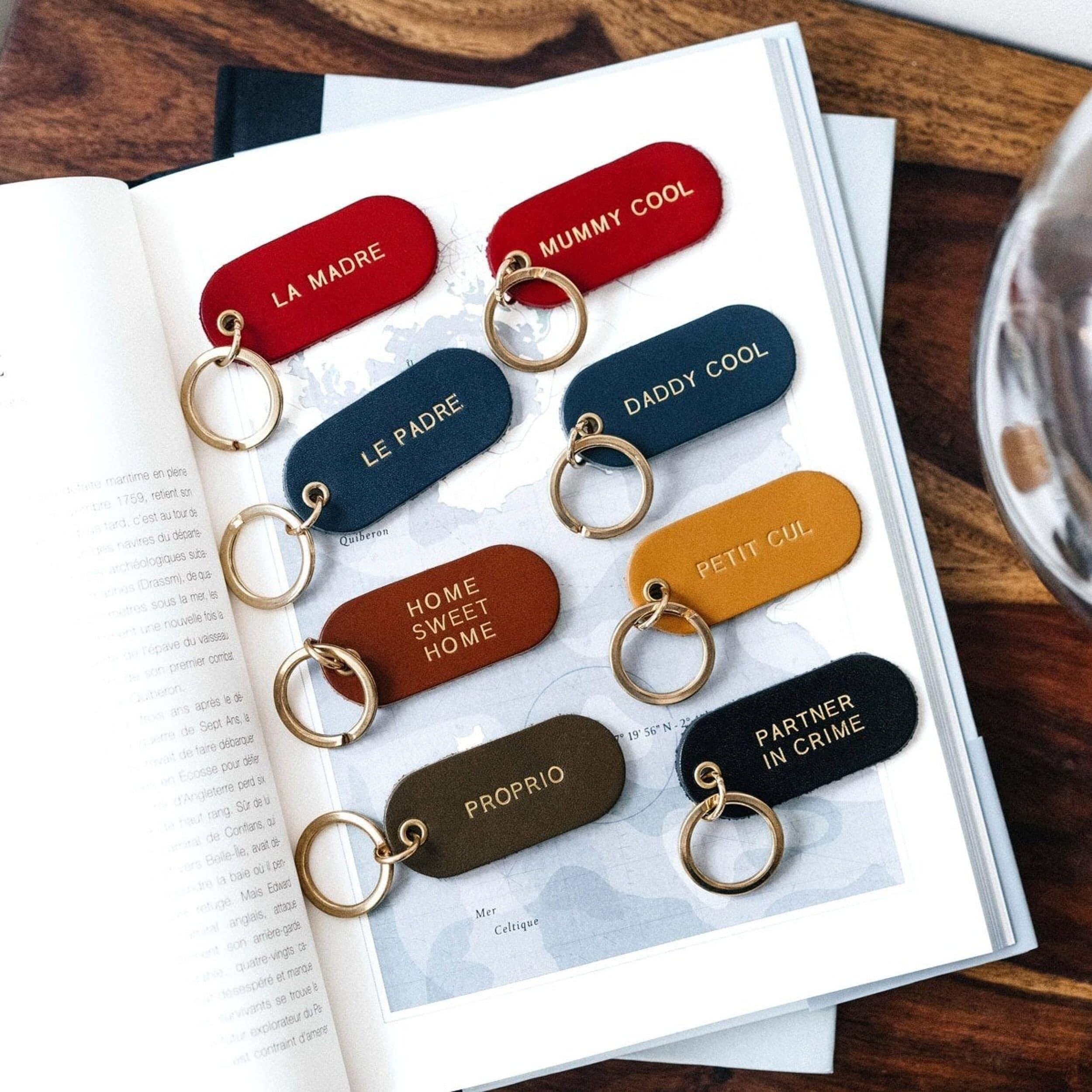 Un porte-clé en cuir à message gravé, parfait pour faire passer un petit mot tendre ou drôle. Fabriqué en France. Dimensions : 6,8 x 3 cm Matériau : cuir de vachette, tannage végétal, boucle et anneau en laiton Dimensions : 6,8 x 3 cm