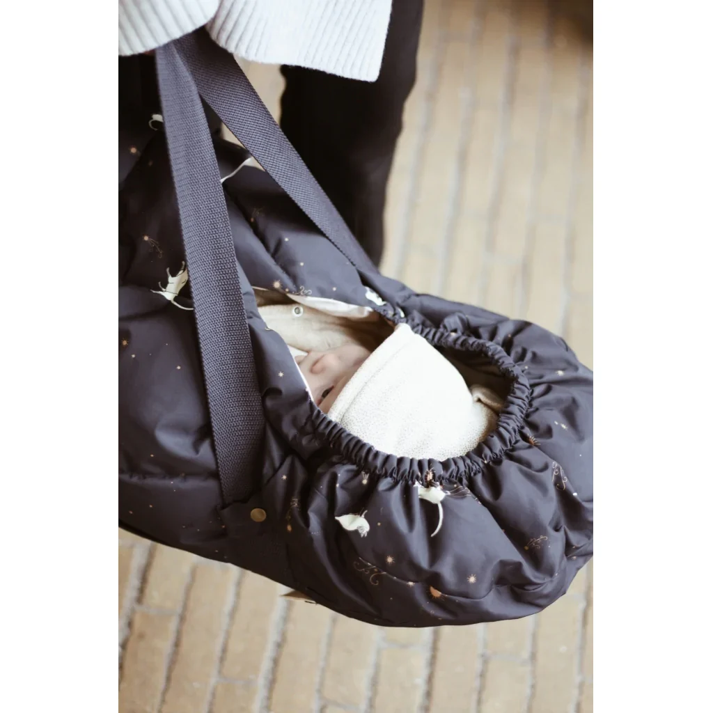 Sac de couchage étanche et confortable avec fonction nacelle et rembourrage intérieur en THERMOLITE. La technologie THERMOLITE® EcoMade ALL SEASON permet à l’enfant de rester au chaud quand il fait frais et au frais quand il fait chaud grâce à une combinaison innovante de fibres. La surface est traitée avec le revêtement BIONIC FINISH ECO, un traitement d’imprégnation hautement respirante et déperlante. Les détails de l’emmaillotage permettent à l’enfant de s’allonger en toute sécurité et assurent une excellente isolation. Cinq trous à l’arrière du sac de couchage, peuvent être utilisés pour installer le harnais d’un landau ou d’une poussette. Une fois dépliée, le le sac de couchage peut être utilisé comme une couverture douce et rembourrée pour jouer. La fonction de cordon de serrage autour de la tête peut être ajustée pour s’adapter aux besoins de l’enfant en pleine croissance et aux conditions de température actuelles. Par ailleurs, le sac de couchage est doté d’une poignée pratique qui vous permet de porter l’enfant pendant qu’il dort.