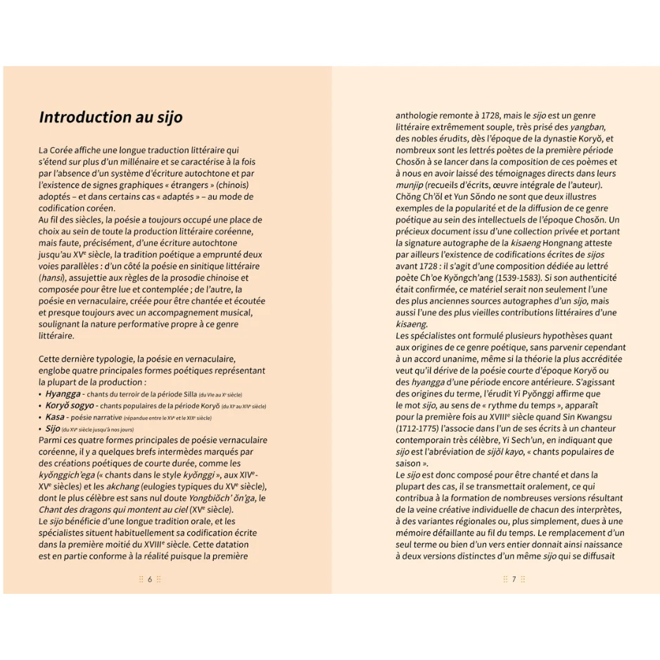 - Chaque poème est présenté en caractères coréens, accompagné de la transcription et de la traduction en français, permettant ainsi à tous les lecteurs de profiter de l’œuvre.