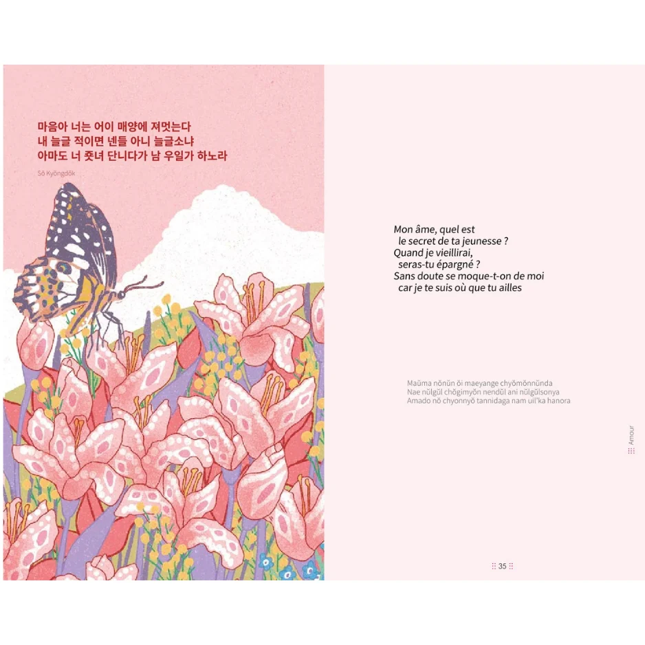 Cet ouvrage se divise en quatre sections, chacune dédiée à l’un de ces thèmes universels : Amour, Nature, Nostalgie et Rêves. Chaque poème est présenté en caractères coréens originaux, accompagné de sa transcription et de sa traduction en français.
