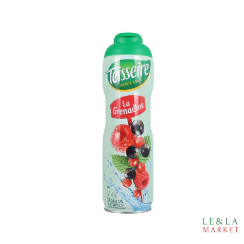 la gourmandise de sirop grenadine Teisseire. Ingrédients Sucre, eau, sirop de glucose-fructose, jus de fruits rouges à base de concentrés 13,5% (groseille, sureau, cassis, framboise), acidifiant : acide citrique, arômes.