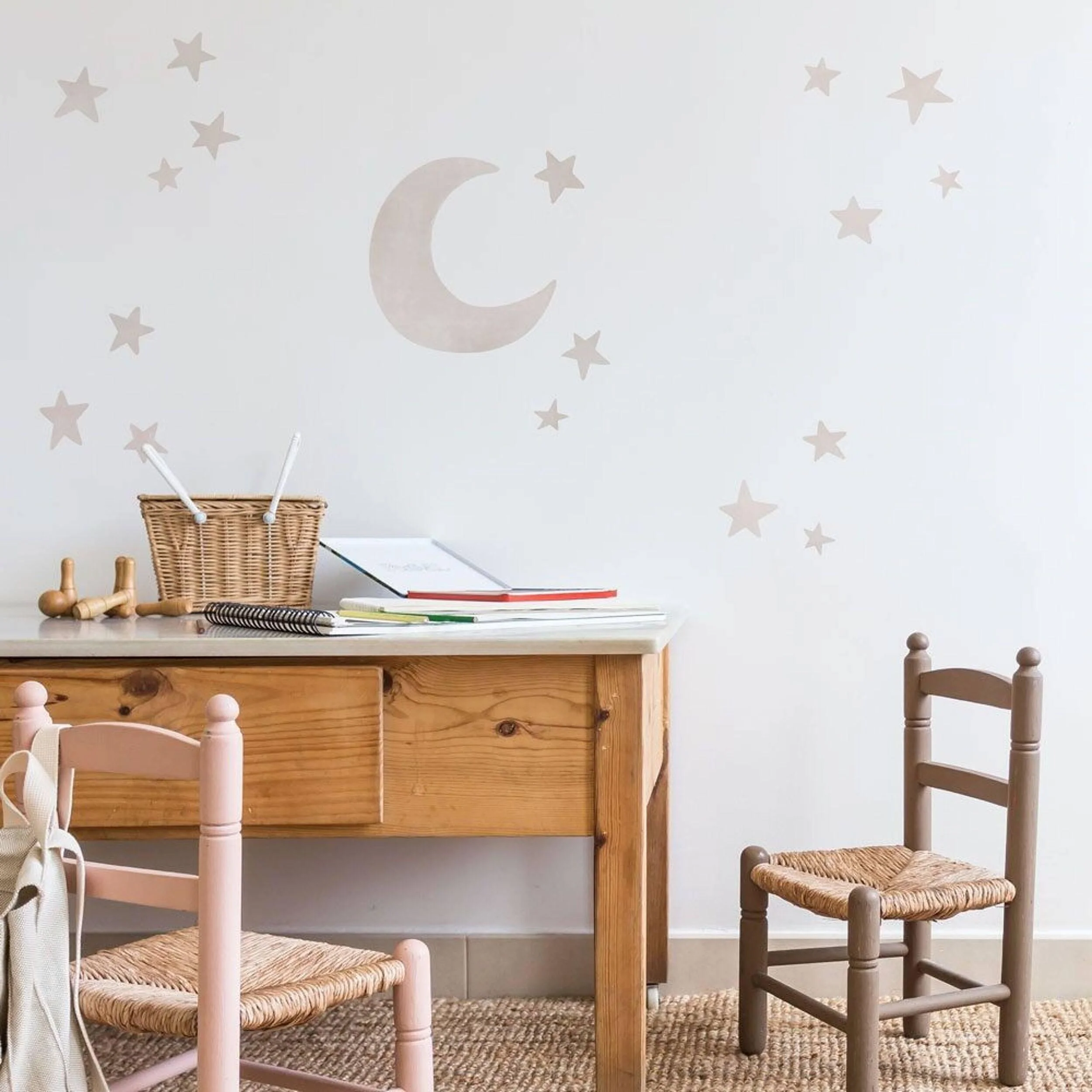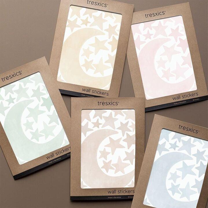 Vinyle décoratif délicat de lunes et d’étoiles produit avec un adhésif décoratif de haute qualité, mat et sans bordure, qui les donnera l’impression d’être peints directement sur le mur. Une alternative au papier peint, moins chère et plus facile à poser.