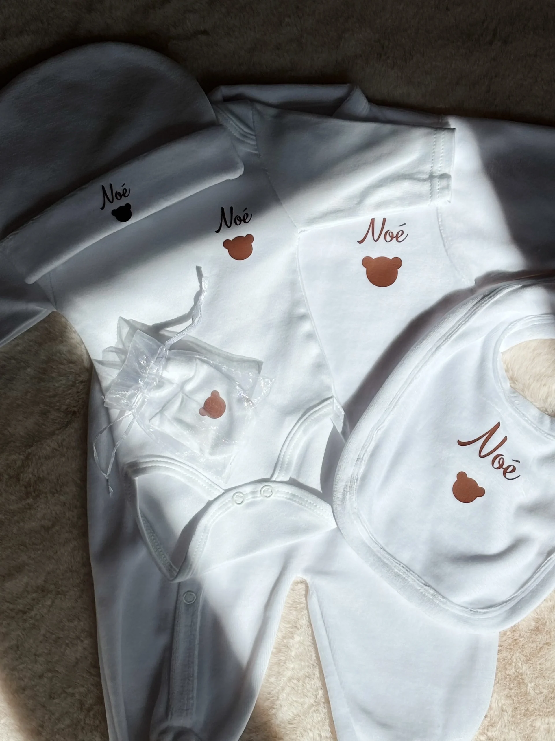Tenue de naissance en velours blanc comprenant : un pyjama en velours un body en coton un bonnet de naissance en velours une paire de moufle un bavoir en velours Taille disponible : 0-3 mois Entièrement personalisable