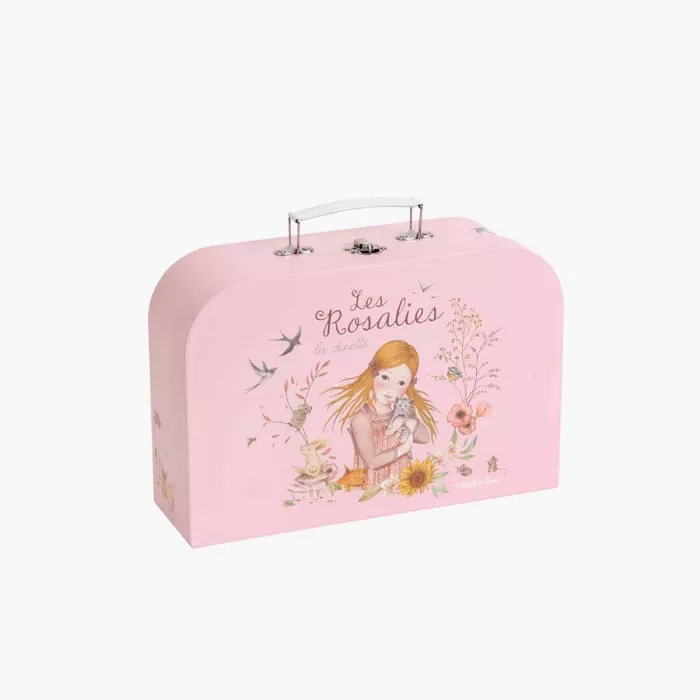 Valise service à thé en métal illustré des fleurs et animaux favoris de nos amies les Rosalie. Elle comprend un plateau, une théière, quatre assiettes à dessert, quatre tasses et leurs soucoupes assorties.