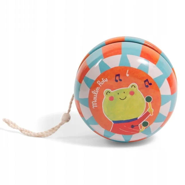 Yoyo en métal comme à l’époque ! Couleurs et motifs rétros entourent une grenouille joueuse de maracas, prête à tournoyer dans les airs !